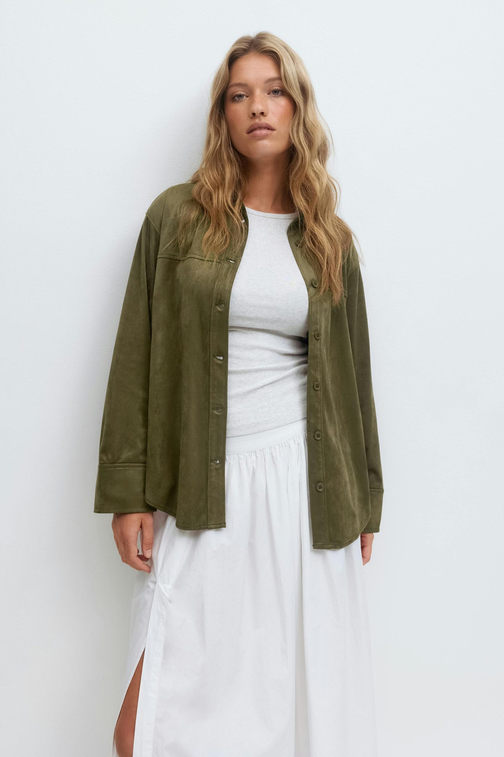 Hemd van imitatiesuède met een overmaatse pasvorm. Het hemd heeft lange mouwen. Het heeft een decoratieve naad aan de voorkant, knoppen aan de voorkant en een ronde halslijn met een kraag.