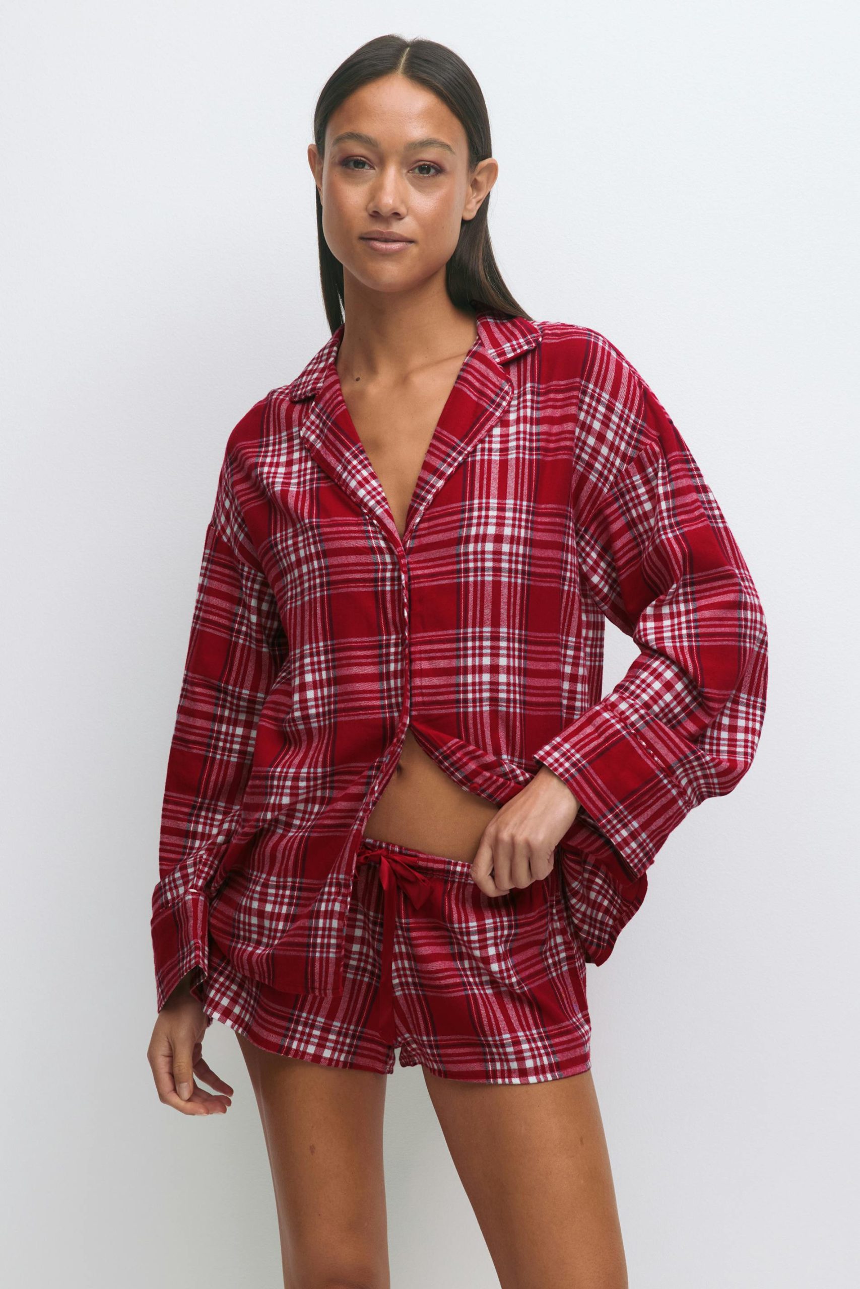 Geruite pyamashort van flanel met elastiek aan de taille. De short is rood en heeft een normale taille. Het heeft een trekkoord van satijn aan de voorkant.