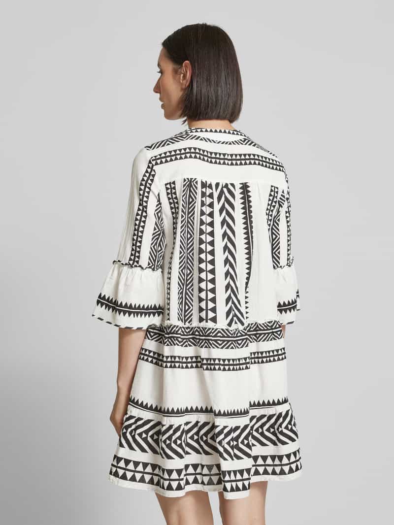 Tuniekjurk van Vero Moda;Model ‘Dicthe’;Look: All-over motief;Lengte: Mini ;Hals: V-hals;Mouwvorm: 3/4-mouw;Mouwboord: Volant;Zoom: Volant;Materiaal: puur katoen;Totale lengte bij maat S: 90 cm;Borstomvang bij maat S: 48 cm;Schouderbreedte bij maat S: 36 cm;Mouwlengte bij maat S: 41 cm