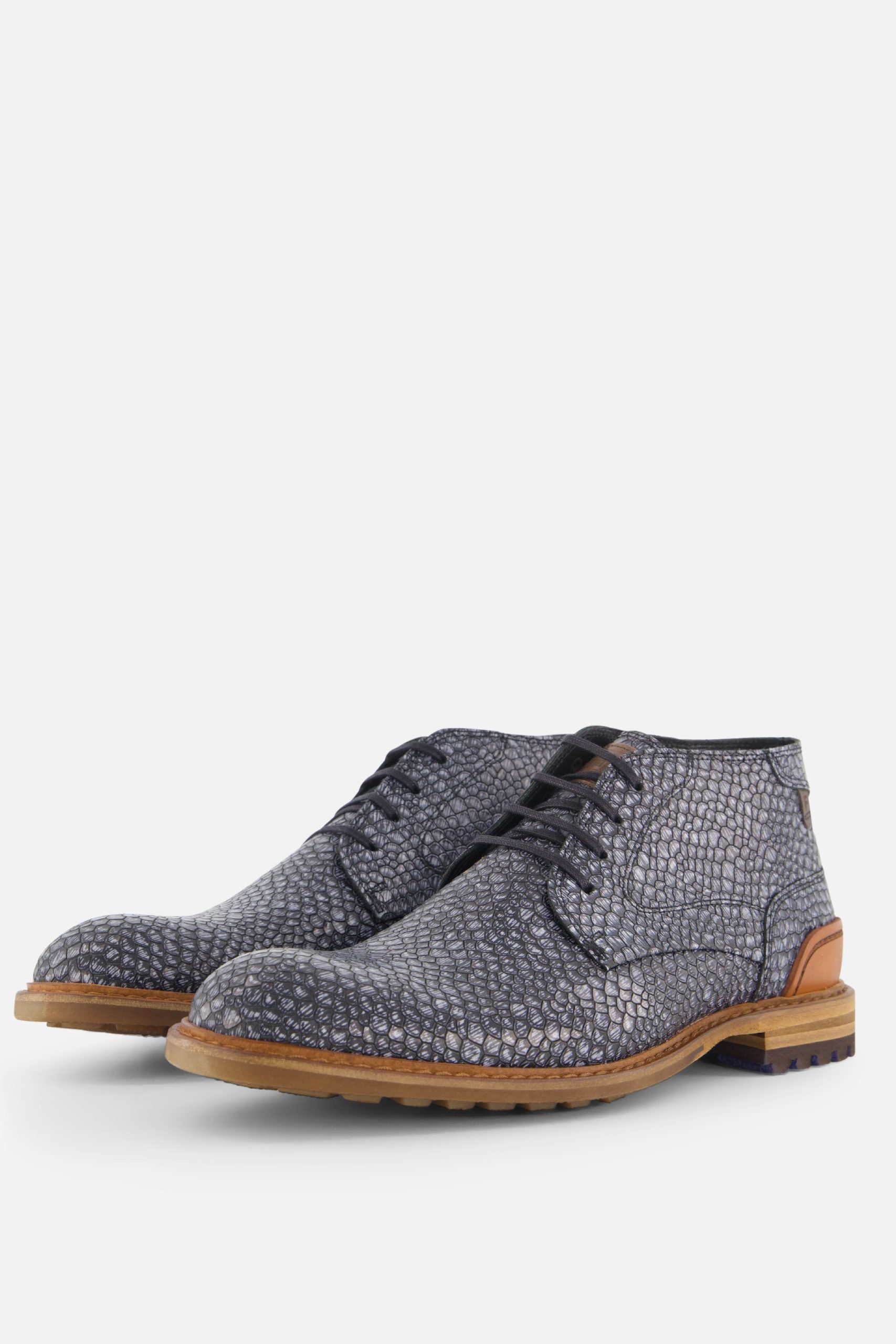 Deze Floris van Bommel Crepi 11.03 veterschoenen in de kleur grijs hebben een bovenwerk van geprint leer. De voering en comfortabele binnenzool zijn van kalfsleer. De achterkant bevat een hielcup met stevig plantaardig gelooid kuipleer. De veterschoenen hebben een 749 H-Leest en een uitneembaar voetbed. De zool is gemaakt van rubber en heeft een dikte van 3 centimeter.
