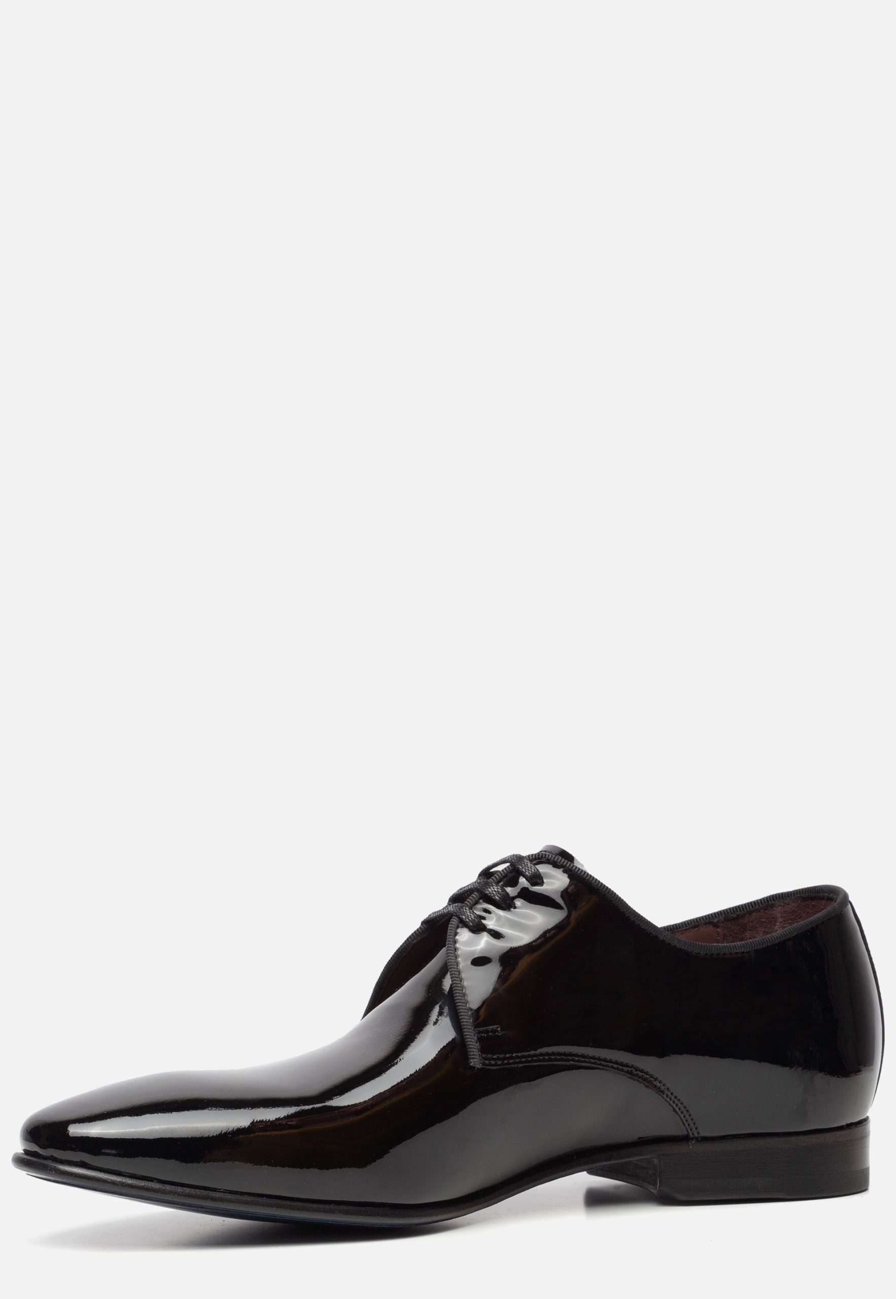 Nette zwarte Floris van Bommel veterschoenen gemaakt van lakleer, met een voering en comfortabel voetbed van leer. De schoenen zijn voorzien van een lak coating, wat ze een classy look geeft en deze schoenen zeer geschikt maakt om te dragen onder een rokkostuum of smoking. Op de binnenzool is een merkopdruk aangebracht. Door middel van veters kunnen deze schoenen gesloten worden. De rubberen zool is voorzien van een zwart gekleurde hak van 1 centimeter. Het voetbed van de nette Floris van Bommel veterschoenen voor heren is niet uitneembaar. De schoenen zijn uitgevoerd in G 1/2-leest, wat ze geschikt maakt voor de normale tot iets bredere voet.