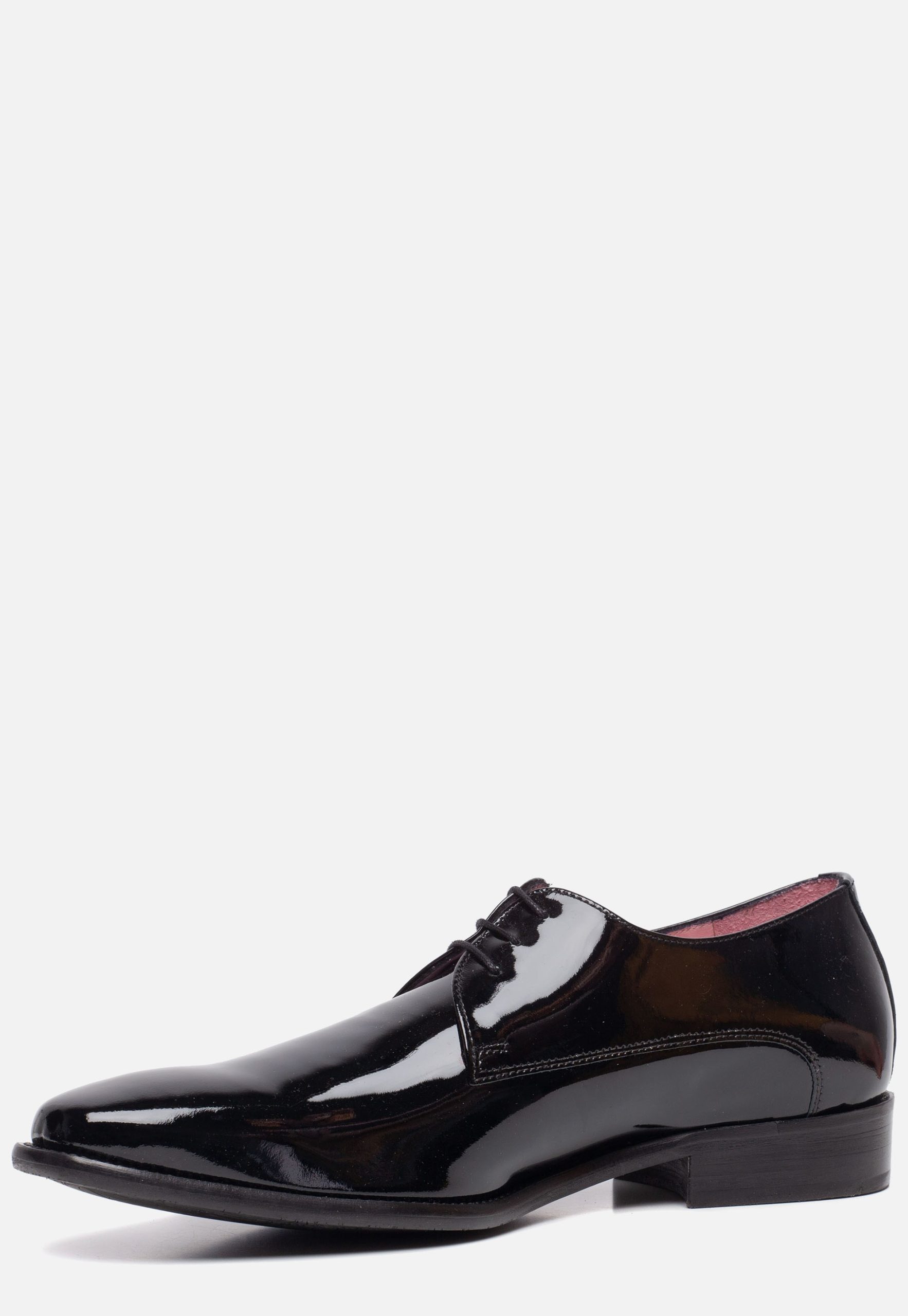 Nette zwarte Floris van Bommel veterschoenen gemaakt van lakleer, met een voering en comfortabel voetbed van leer. De schoenen zijn voorzien van een lak coating, wat ze een classy look geeft en deze schoenen zeer geschikt maakt om te dragen onder een rokkostuum of smoking. Op de binnenzool is een merkopdruk aangebracht. Door middel van veters kunnen deze schoenen gesloten worden. De rubberen zool is voorzien van een hak met een dikte van 2 centimeter. De schoenen hebben een H-Leest, wat betekent dat ze perfect zijn voor de wat bredere voeten. Het voetbed van de nette Floris van Bommel veterschoenen is niet uitneembaar.
