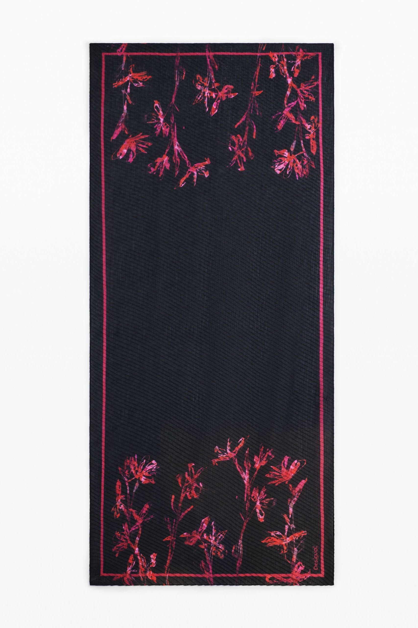 Dikke rechthoekige foulard met effen achtergrond en bloemenprint van orchideeën in levendige kleuren.