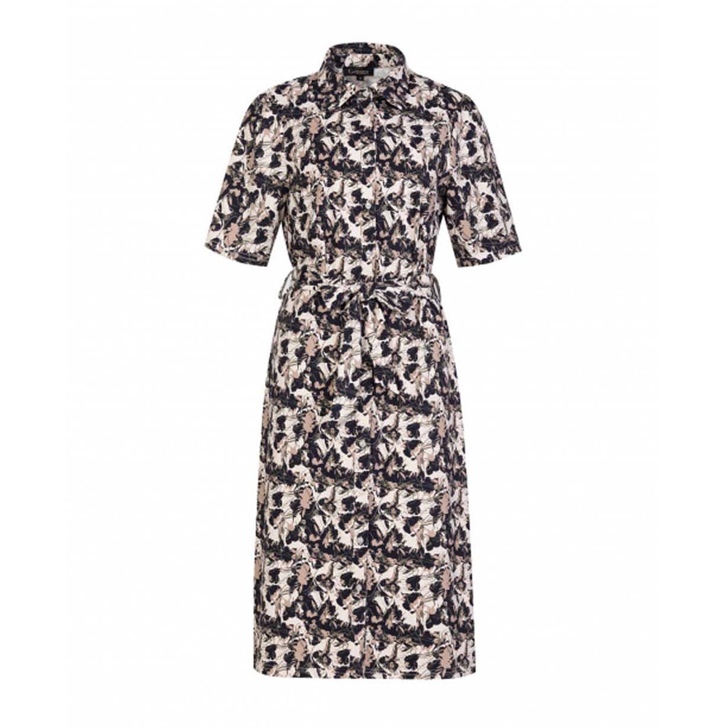 Ontdek al het moois van het voorjaar met het omantische abstracte dessin van de Moon jurk, gemaakt van travelstof. Deze jurk heeft een A-lijn model met een klassieke kraag, een knoopsluiting langs de voorzijde en een strikceintuur rond de taille.