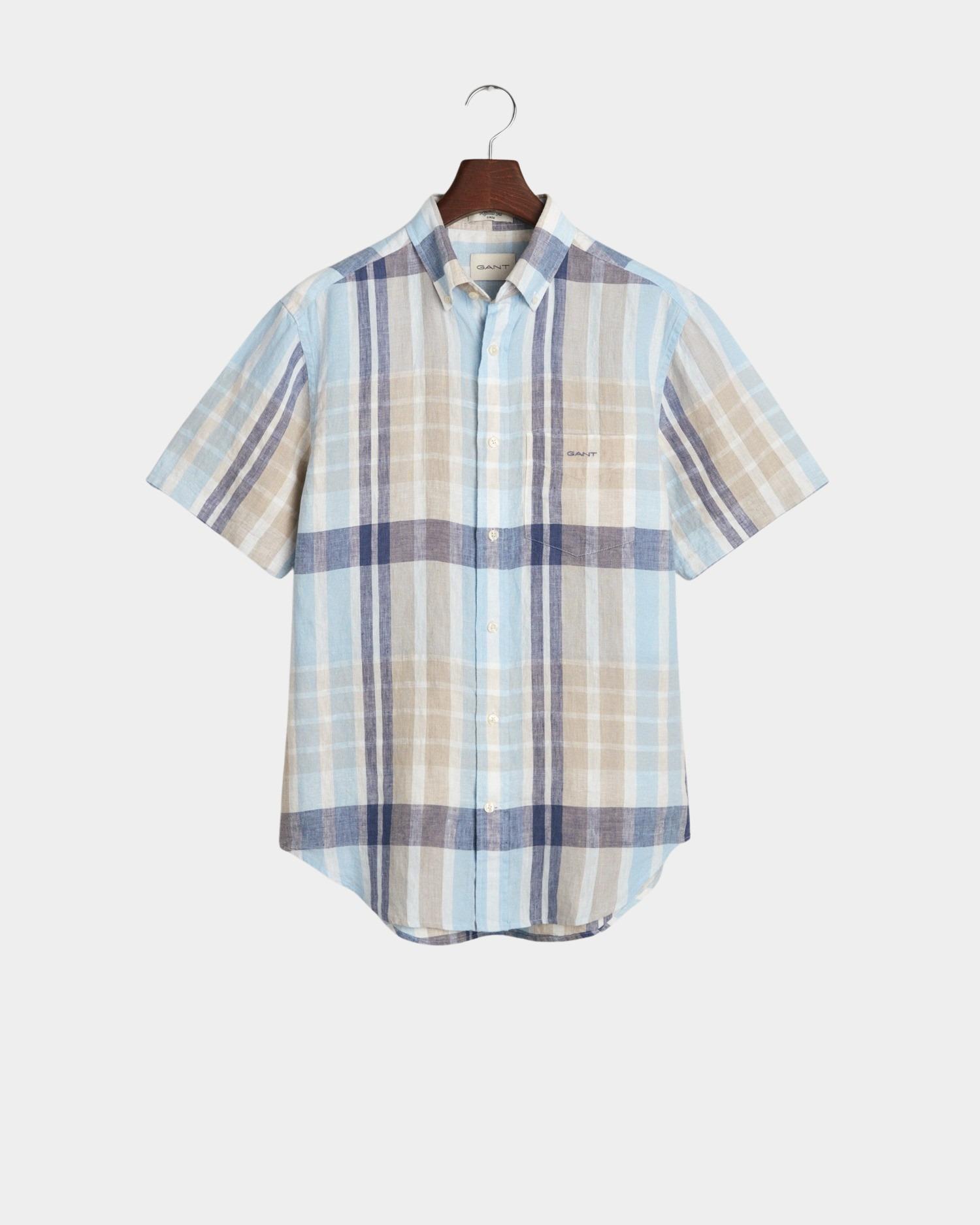 Blauw casual hemd met korte mouwen van Gant. Gemaakt van 100% linnen in regular fit, ideaal voor de lente/zomer. Dit overhemd kan gewassen worden tot maximaal 30°C. Het overhemd heeft een button down kraag en is voorzien van een borstzak. Met zijn luxueuze stof en relaxte pasvorm is dit hemd perfect voor een stijlvolle en comfortabele look tijdens warmere dagen. Draag het op een chino voor een casual outfit of combineer het met een blazer voor een meer formele uitstraling. De diepblauwe kleur voegt een vleugje verfijning toe aan elke outfit, terwijl het linnen materiaal zorgt voor een luchtige en ademende ervaring. Een veelzijdig kledingstuk dat niet mag ontbreken in de garderobe van elke moderne man. Update je kledingcollectie met dit tijdloze en trendy Gant overhemd.