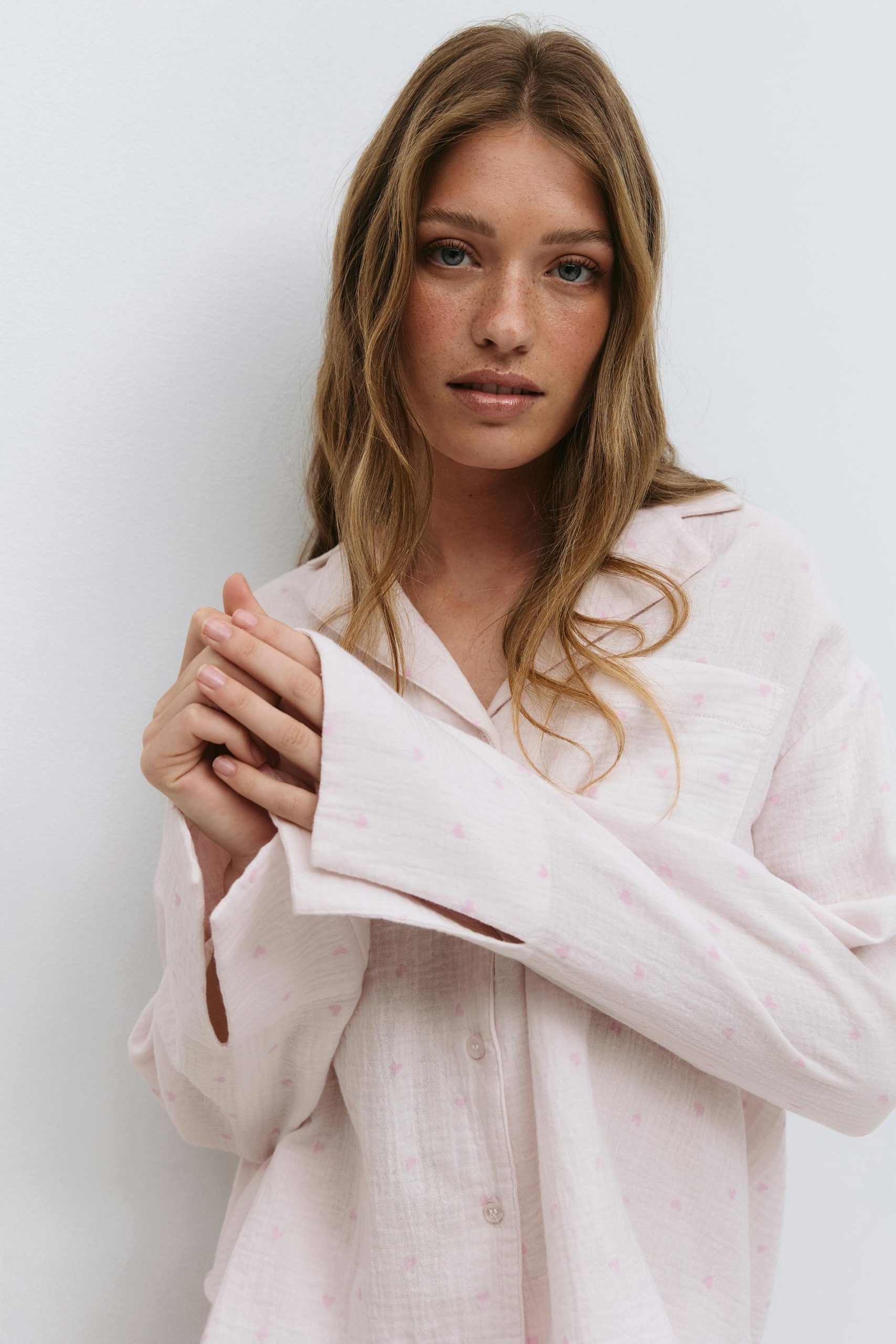 Pyjamahemd met smalle harten. Het hemd is roze en heeft overmaatse pasvorm. Het heeft gestructureerd materiaal, kraag, dichtknopen aan de voorkant, v-hals, borstzak en lange mouw met spleet en manchet.