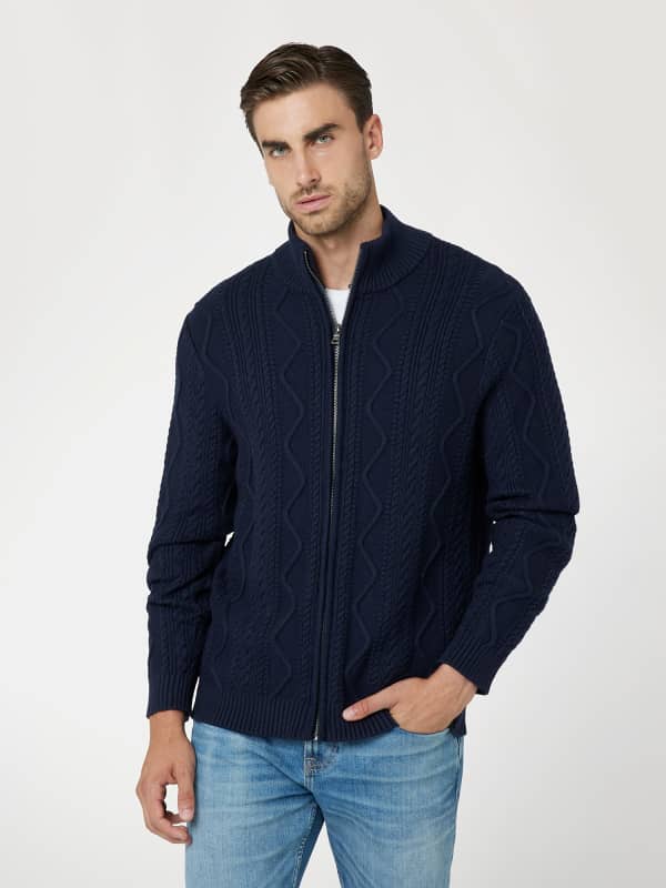 Gebreid vest met kabels van gemengde viscose.Hoge col.Lange mouwen.Regular fit.Ritssluiting.Het model draagt maat M.Zie onze bovenstaande maattabel.Totale lengte: 65,4 cm / 25,8 inch.Mouwlengte: 64,1 cm / 25,3 inch.Valt normaal op maat.