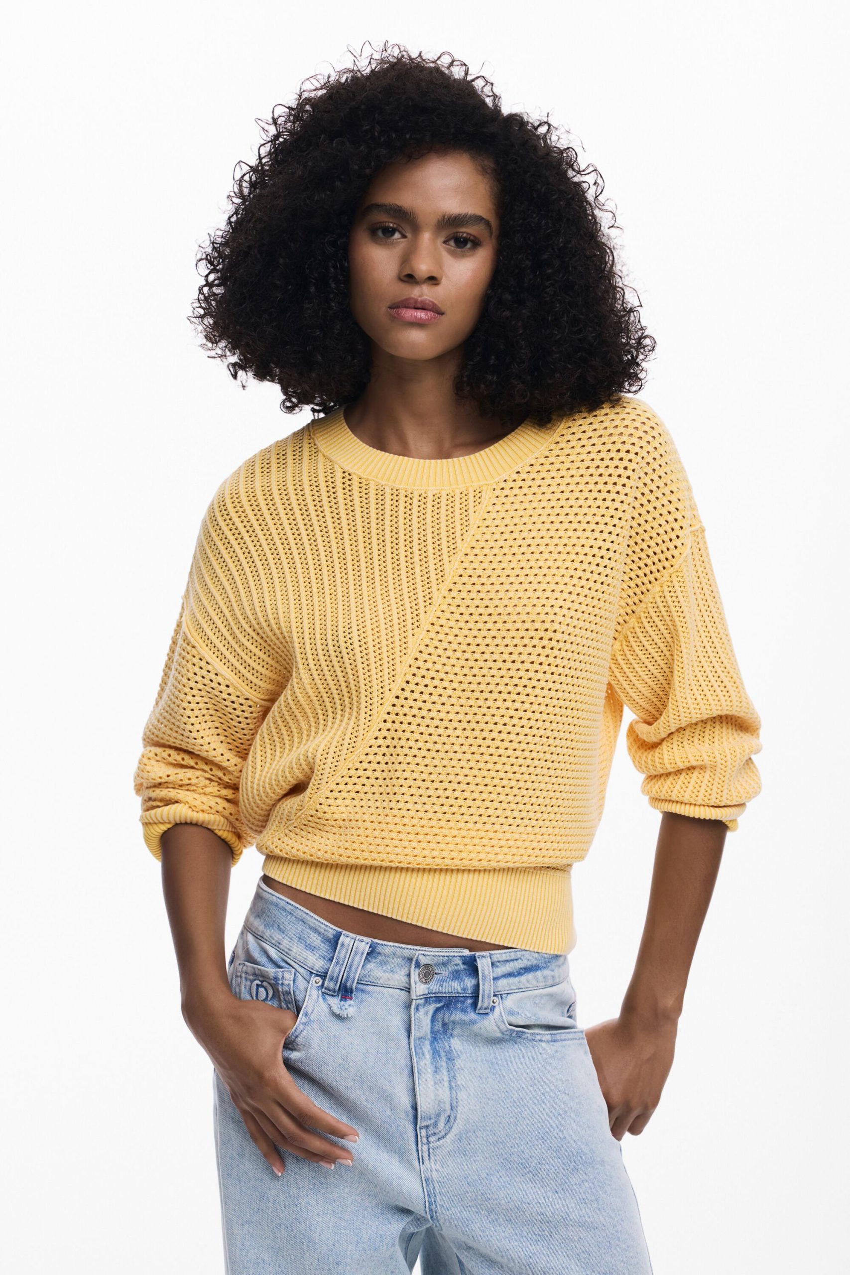 Fijn gebreide trui met lange mouwen van licht katoen, voorzien van een geborduurd logo aan de onderkant.