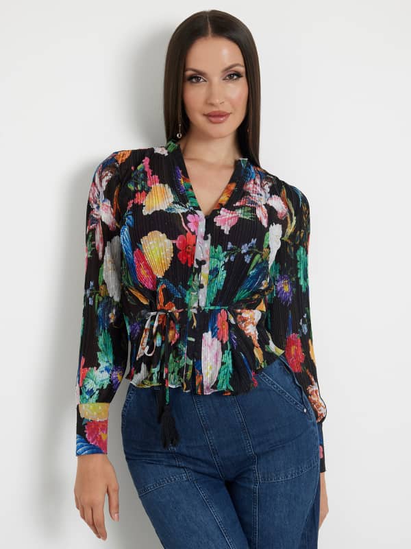 Regular fit geplooide blouse.V-hals en lange mouwen.Met riem en knoopsluiting aan de voorkant.Het kledingstuk op de afbeelding is maat S.Totale lengte: 57,2 cm / 22,5 inch.Mouwlengte: 59,7 cm / 23,5 inch.Valt normaal op maat.