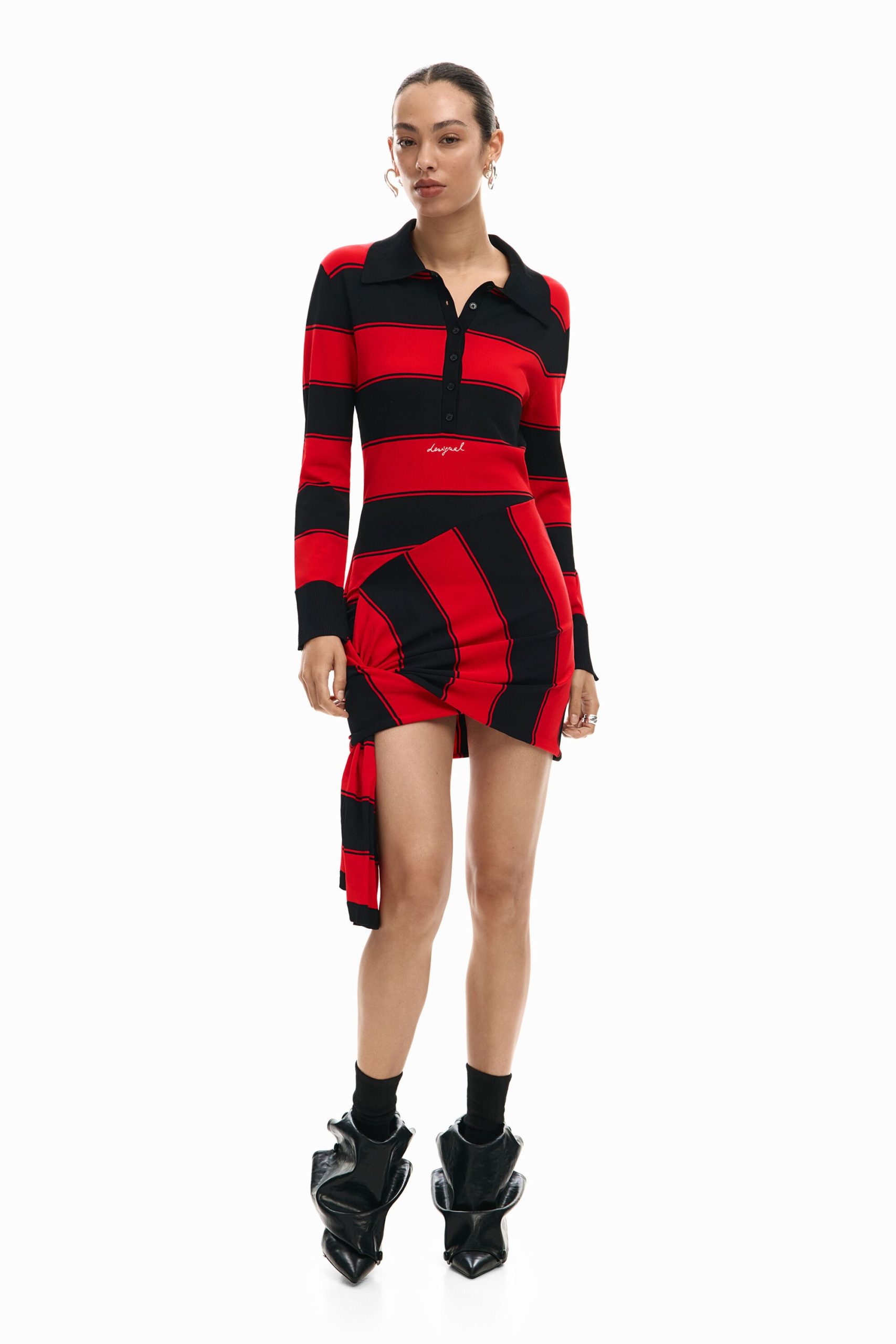 Gebreide jurk met horizontaal gestreepte print in zwart en rood. Polokraag en lange mouwen in vlak breisel. Middellange lengte en ontwerp met tailleaanpassing.