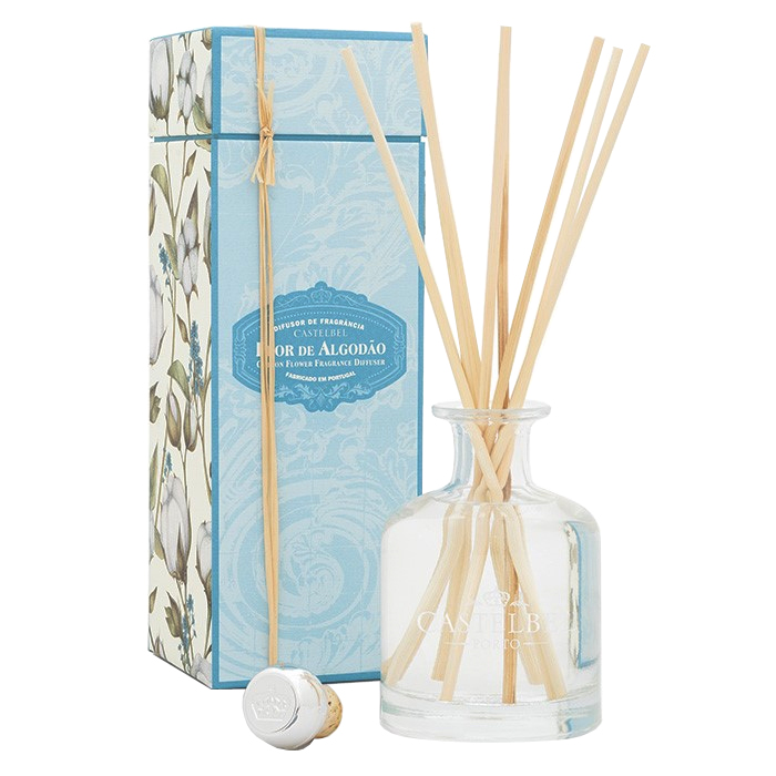 Geurdiffuser in cadeaudoosje van het Portugese merk Castelbel. De geurstokjes absorberen de geurolie uit de houder, waarna ze maandenlang de delicate geur van katoenbloem verspreiden.Afhankelijk van de hoeveelheid geurstokjes die u in de vloeistof plaatst, kan de intensiteit van de geur naar wens worden aangepast. Voor een optimale geurbeleving raden wij aan de Flor de Algodao geurstokjes iedere 4-5 dagen om te draaien.