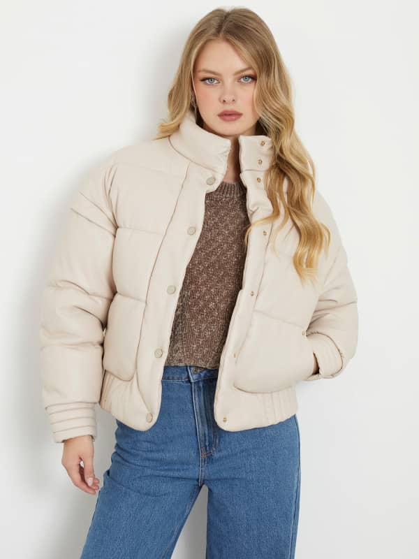 Gewatteerde gevulde imitatieleer jas.Hoge col.Lange mouw.Regular fit.Sluiting met knopen.STOF: Imitatieleer.VULLING: Polyester.DETAILS: Zakken aan de zijkant.Het kledingstuk op de afbeelding is maat S.Totale lengte: 56 cm / 22,05 inch.Mouwlengte: 53 cm / 20,87 inch.Valt normaal op maat.