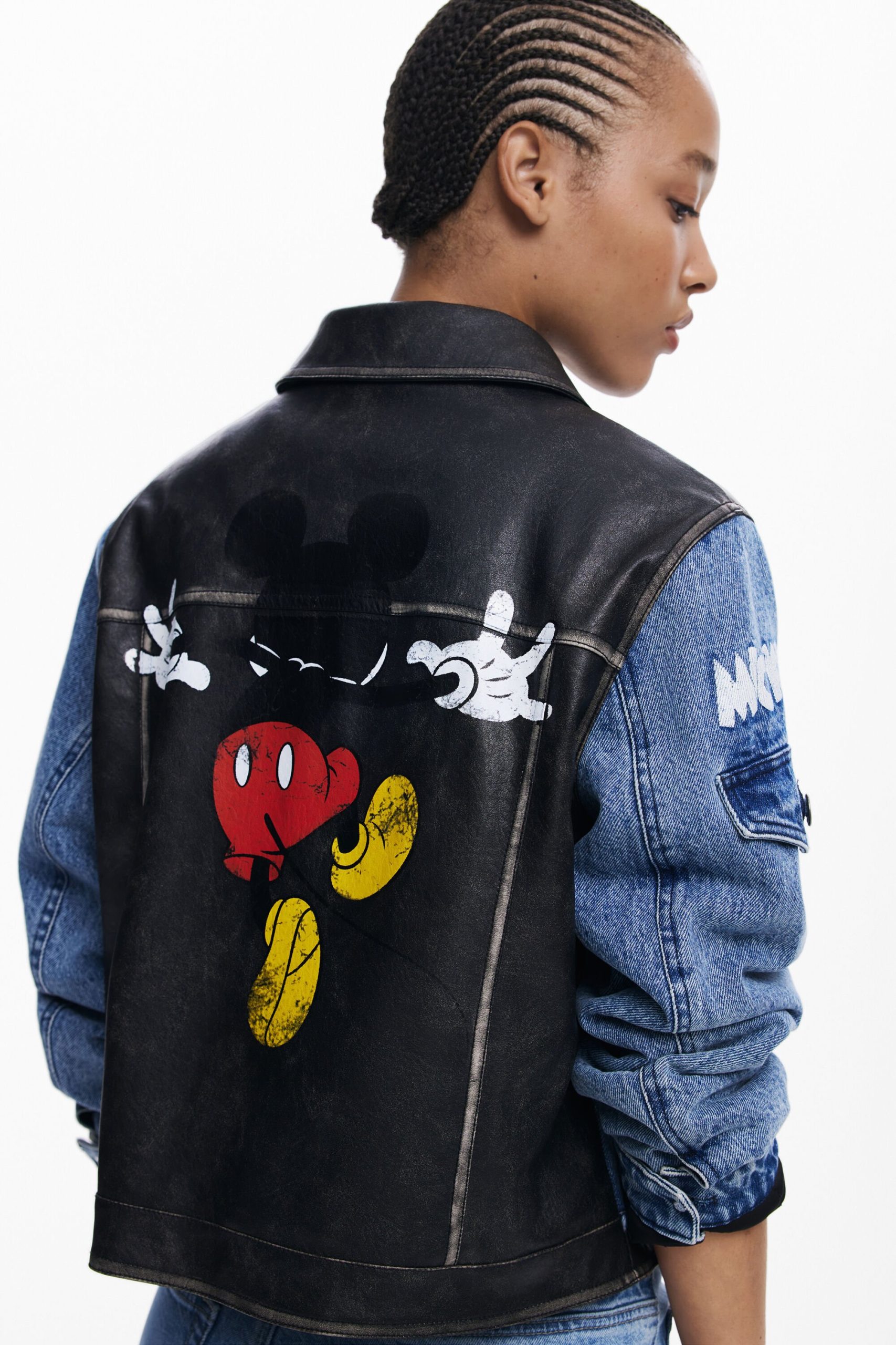 Tweekleurige spijkerjack in Trucker-stijl met gewaxt effect, meerdere voorzakken en Mickey Mouse™-print.