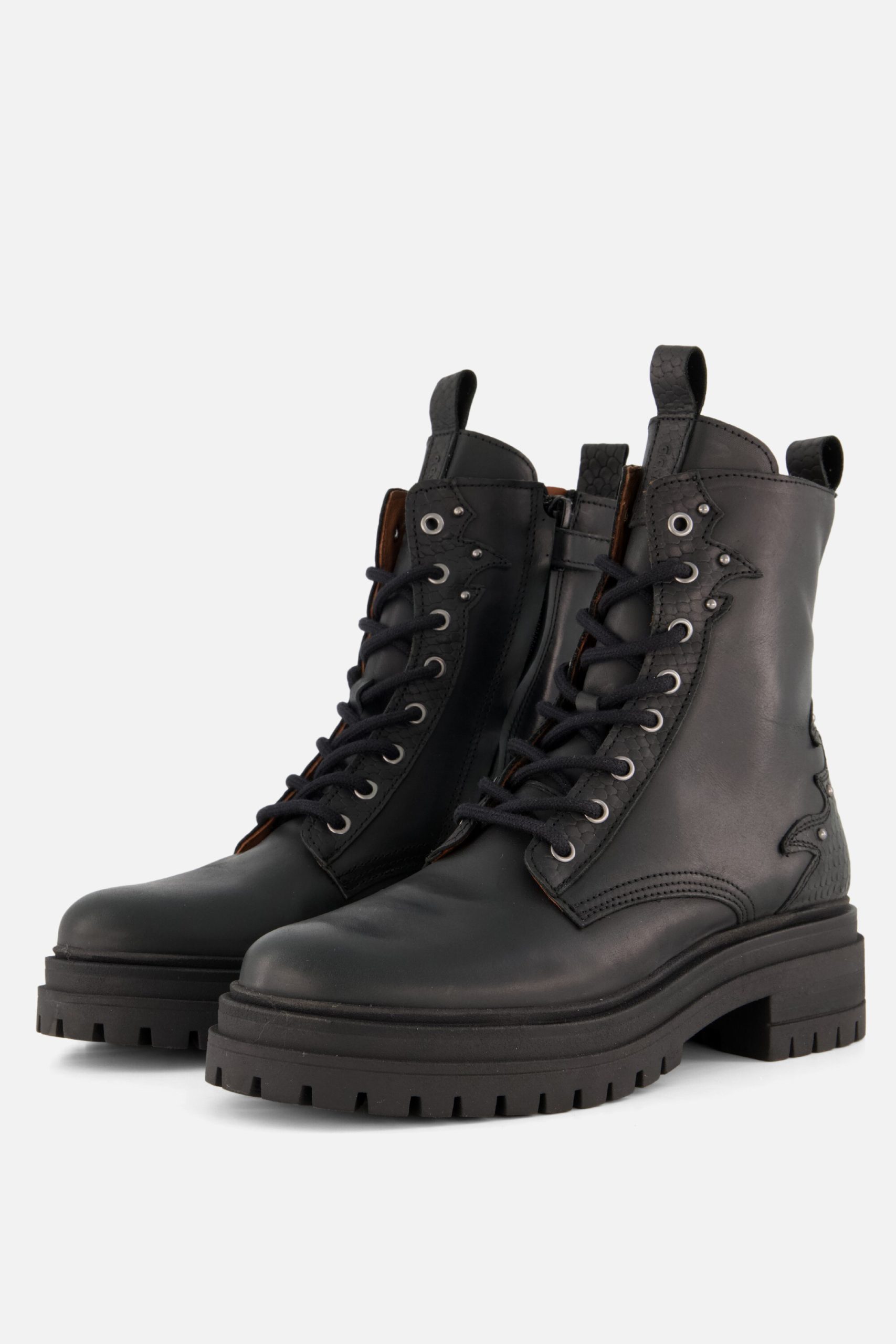 De Giga veterboots voor meisjes zijn uitgevoerd in zwart leer en bieden zowel een stoere als stijlvolle uitstraling. Met een leren boven- en binnenkant voelen ze stevig en comfortabel aan. Dankzij de combinatie van veters en een rits zijn ze eenvoudig aan te trekken en goed passend te maken.