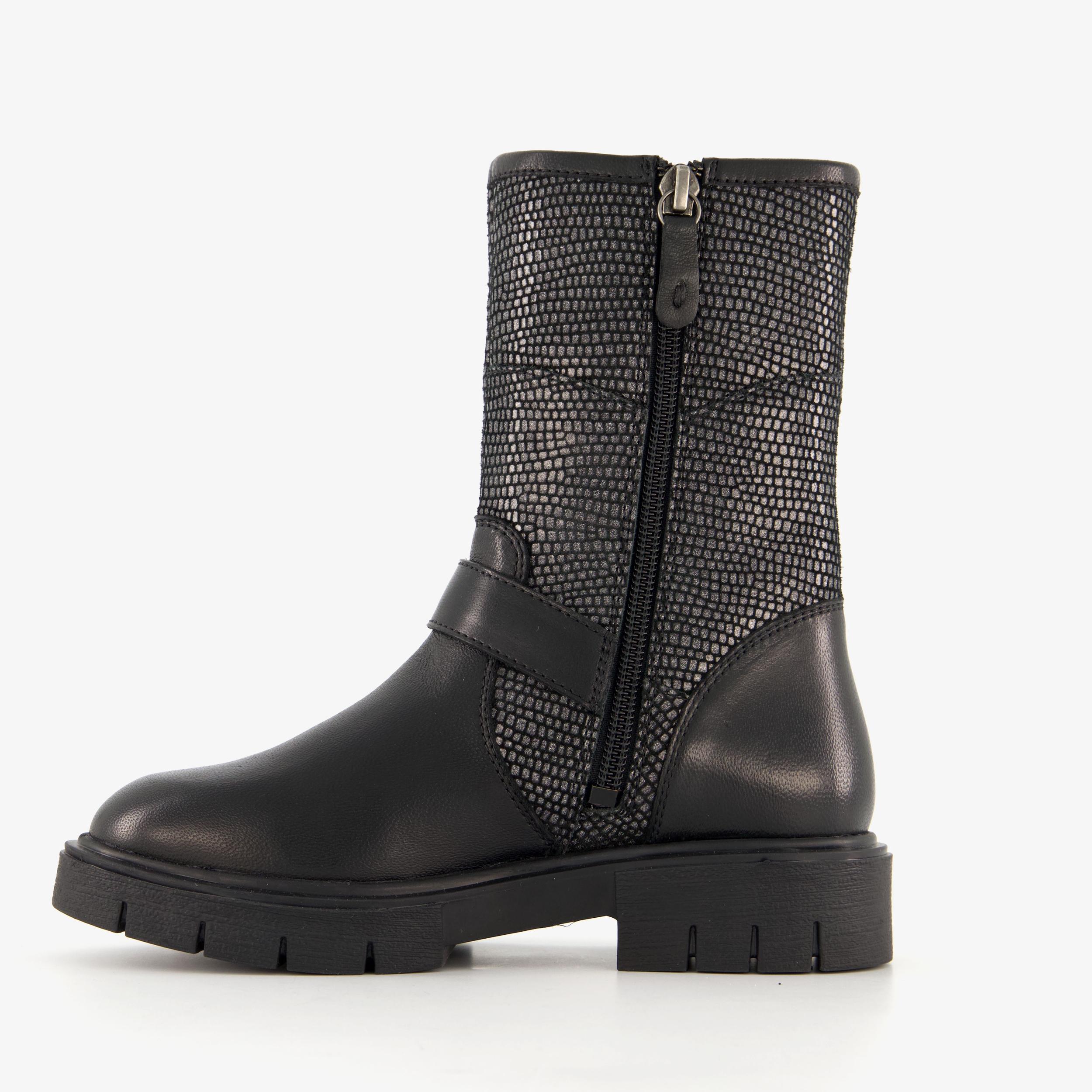 Zwarte biker boots voor meisjes van Groot. Gemaakt van leer, een binnenwerk van textiel en een rubberen zool. De boots hebben een ritssluiting aan de binnenzijde en twee gespen. Het vaste voetbed is gemaakt van leer. De stoere biker boots hebben een metallic dessin op het bovenwerk en een schachthoogte 18 cm.