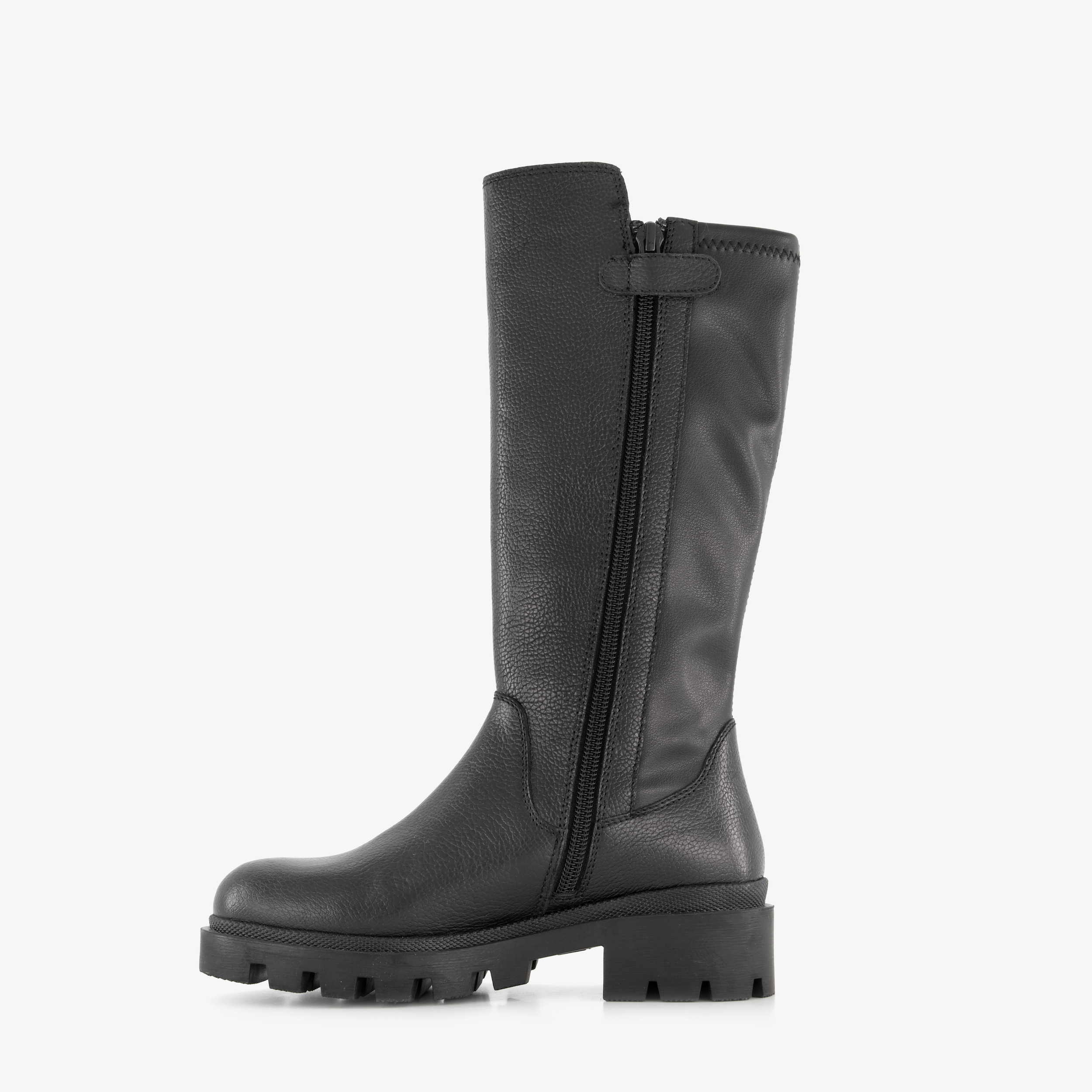Hoge, zwarte laarzen voor meisjes van Groot. Het buitenwerk is gemaakt van leer, het binnenwerk van textiel en de grove buitenzool is van rubber. Voorzien van een ritssluiting met een klittenbandje aan de binnenzijde en een comfortabele binnenzool van leer. Deze is uitneembaar. De laarzen hebben een laag hakje en de schachthoogte is 25 cm.