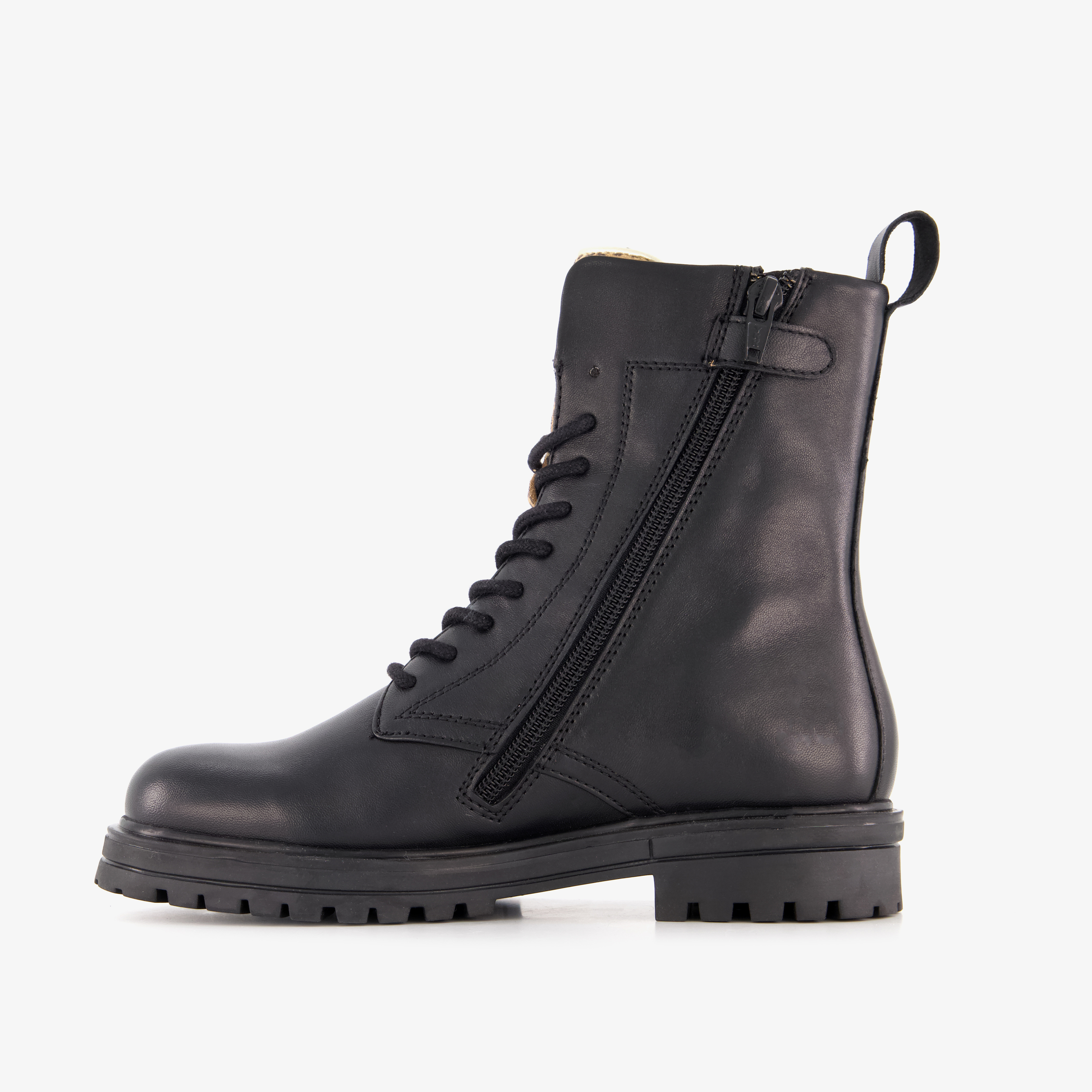 Zwarte veterboots voor meisjes. Gemaakt van leer, een binnenwerk van leer en een rubberen zool. De boots hebben een rits- en vetersluiting met een hiellusje. De uitneembare binnenzool is gemaakt van leer. De veterboots hebben luipaardprint op de tong en een schachthoogte van 15 cm.
