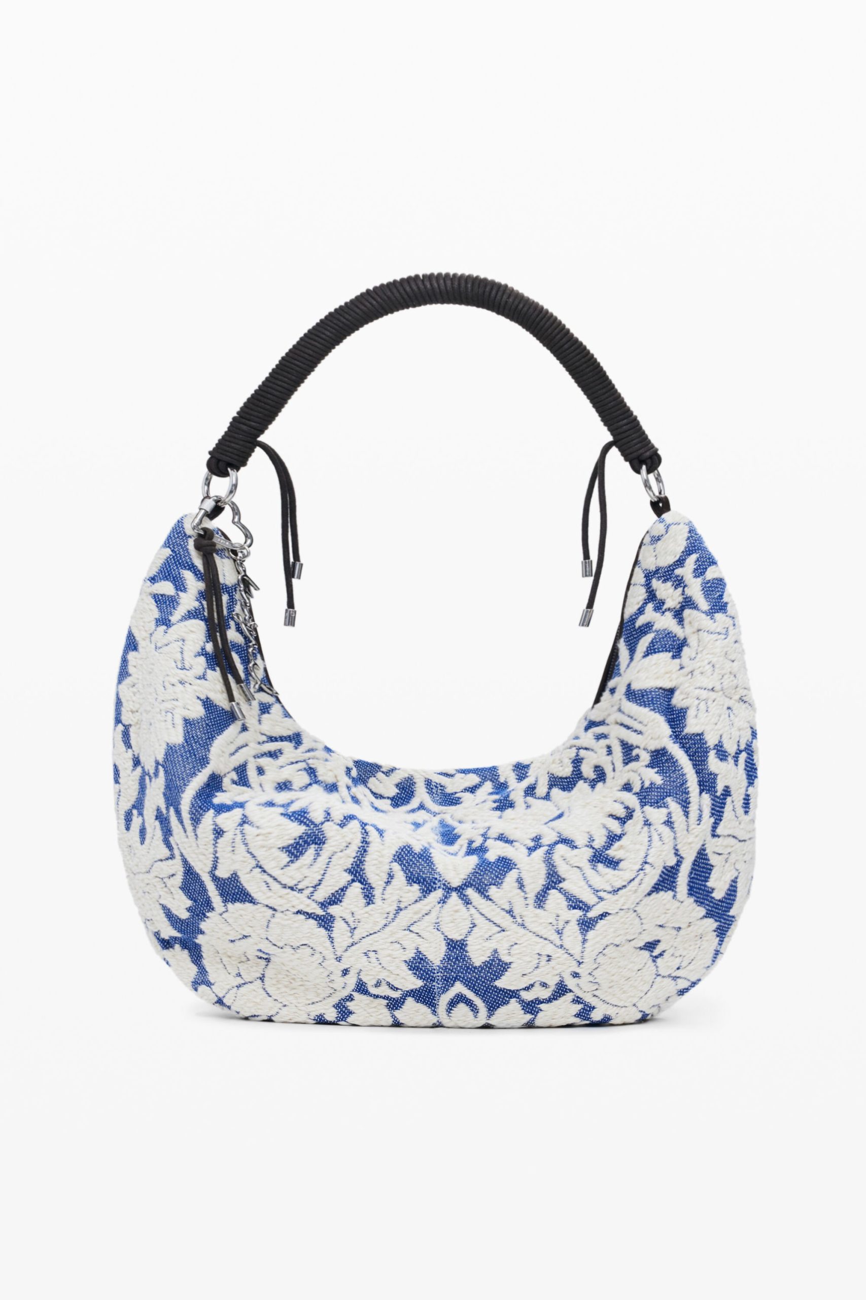 Schoudertas in zakstijl, groot formaat, gevlochten handvat, ritssluiting en bloemenprint in devoré-stijl.