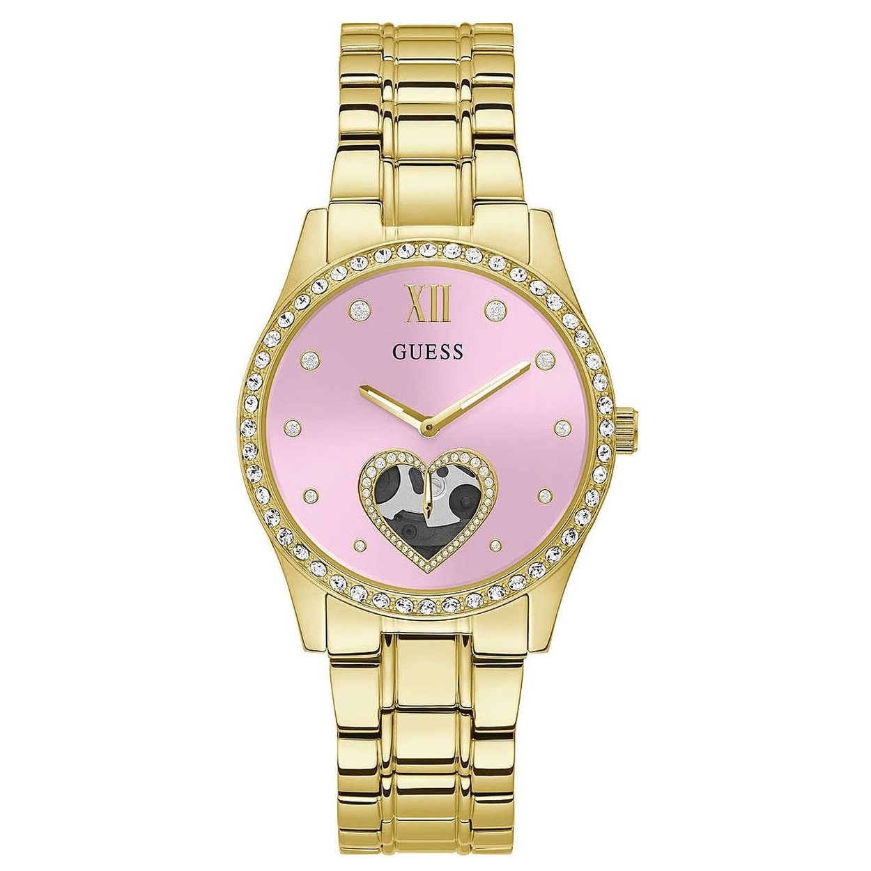 Guess dameshorloge met een ”open hart” op de wijzerplaat. Door de opening is een deel van het uurwerk zichtbaar. Het hartje, de uurmarkeringen en de bezel zijn ingelegd met zirkonia steentjes.