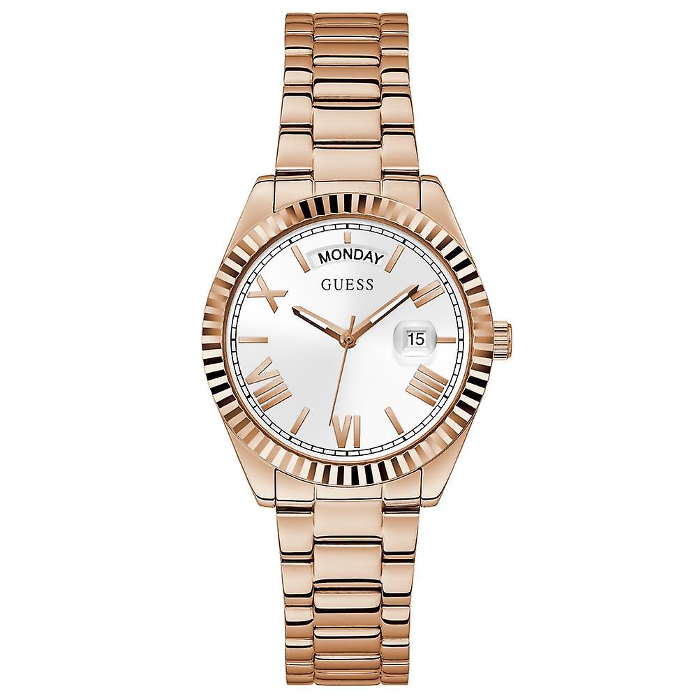 Cool dameshorloge van het merk Guess. Het horloge is voorzien van een geribbelde bezel, Romeinse uurmarkeringen en een dagaanduiding bij de 12 uur.