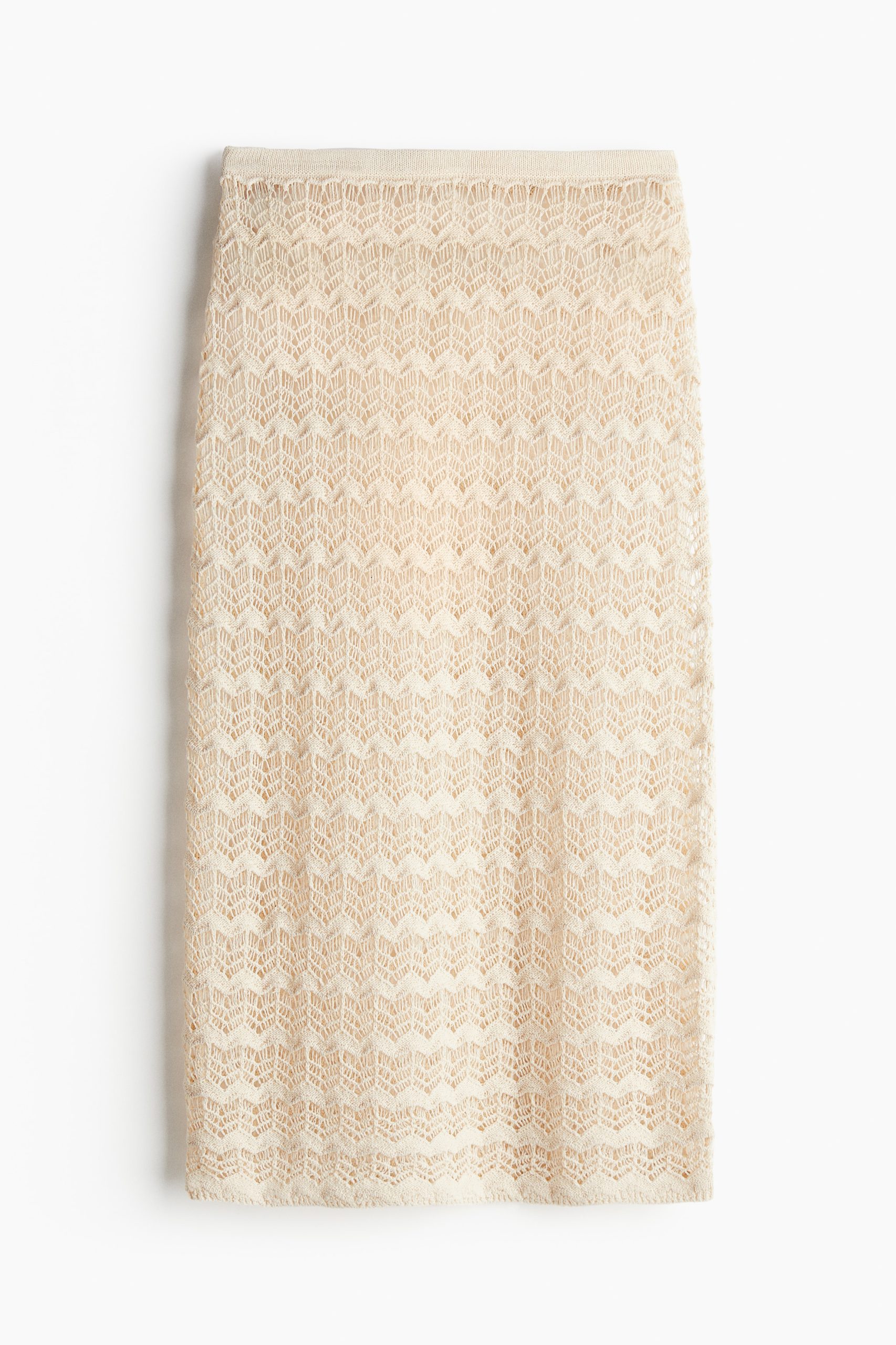Een halflange strandrok van een zachte, ajourgebreide kwaliteit met een geribde tailleband met elastiek en een rechte belijning aan de onderkant. Ongevoerd.