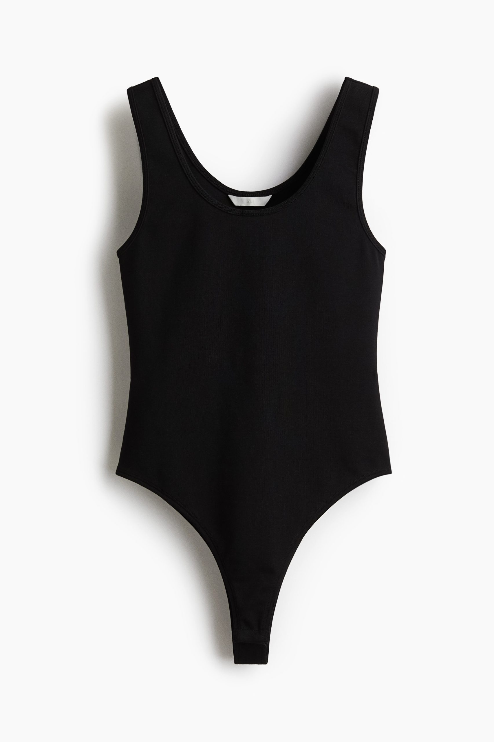 Een body van zacht katoenen tricot met brede schouderbandjes en een diep, rond decolleté voor en achter. Het model heeft een blinde drukknoopsluiting in het kruis en een iets hoger uitgesneden belijning bij het zitvlak.