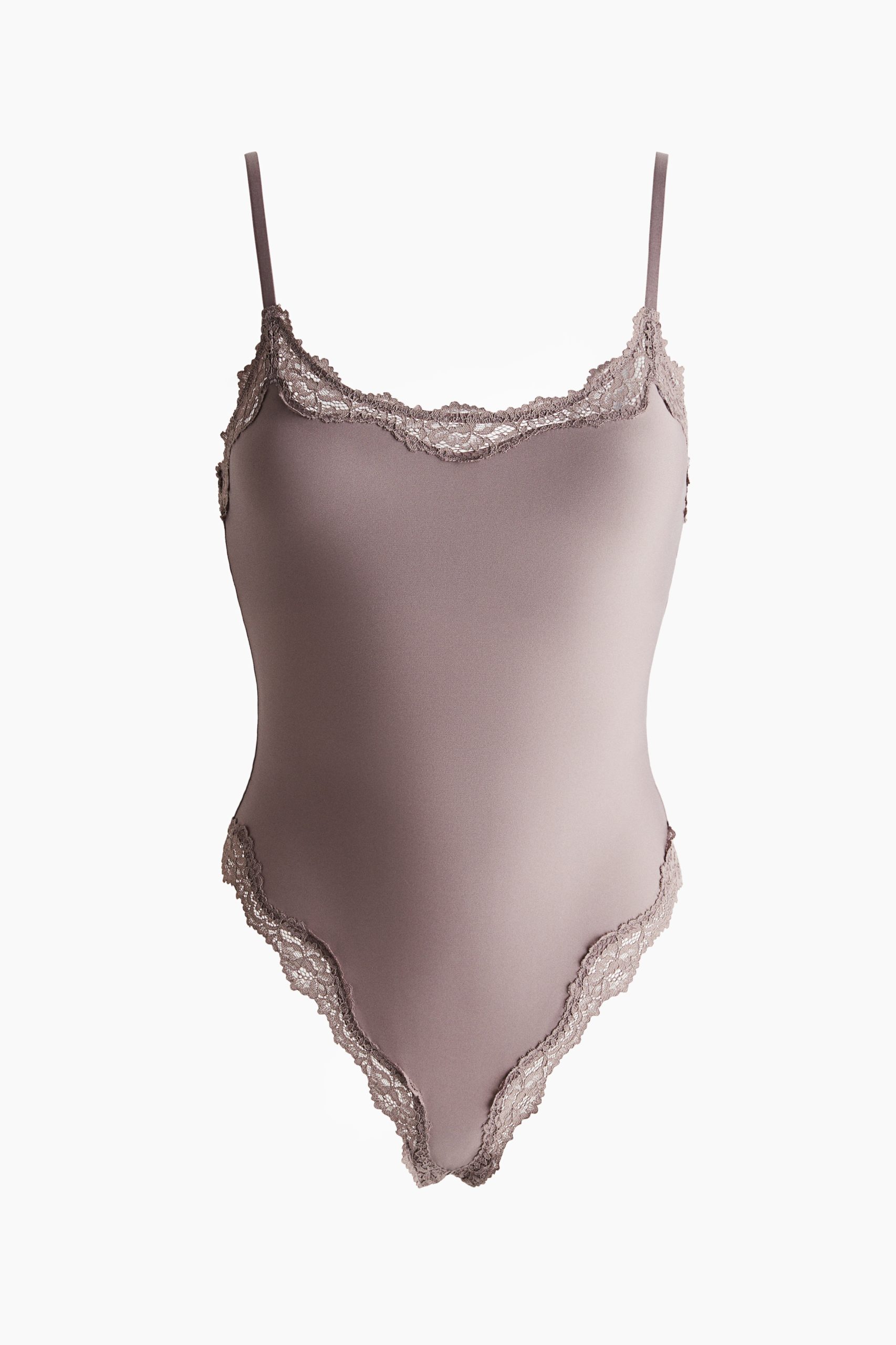 Een body van zachte microvezel met kanten biezen. Het model heeft verstelbare schouderbandjes, cups met uitneembare vulling die de borsten vorm geven en goede ondersteuning bieden, een gevoerd kruis met een blinde drukknoopsluiting en een hoog uitgesneden belijning bij het zitvlak.