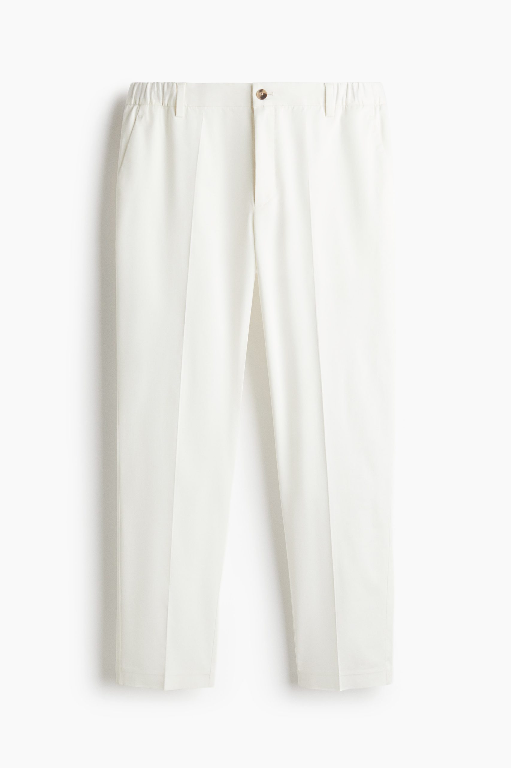 Een enkellange broek van zacht katoenen twill met persvouwen. Het model heeft elastiek in de taille, een gulp met ritssluiting en knoop, schuin ingezette steekzakken en ingezette achterzakken met knoop. Slim Fit voor een aansluitende pasvorm die de contouren van je lichaam accentueert.