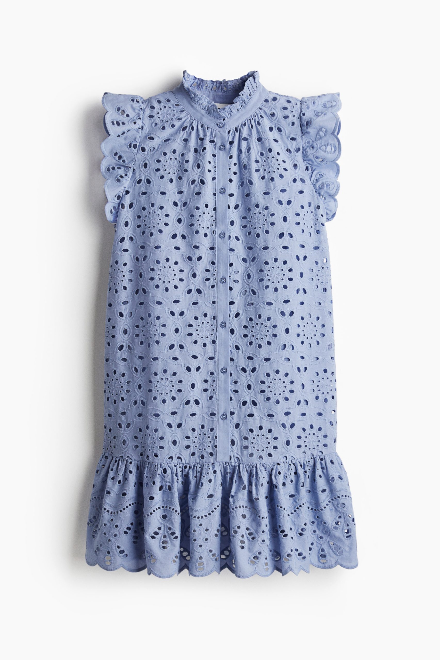 Een korte jurk van geweven katoen met all-over broderie anglaise. Het model heeft een kraag met een volantrandje, een knoopsluiting voor, volantmouwtjes en een aangerimpelde volant aan de onderkant voor extra volume. Katoenen onderjurk.