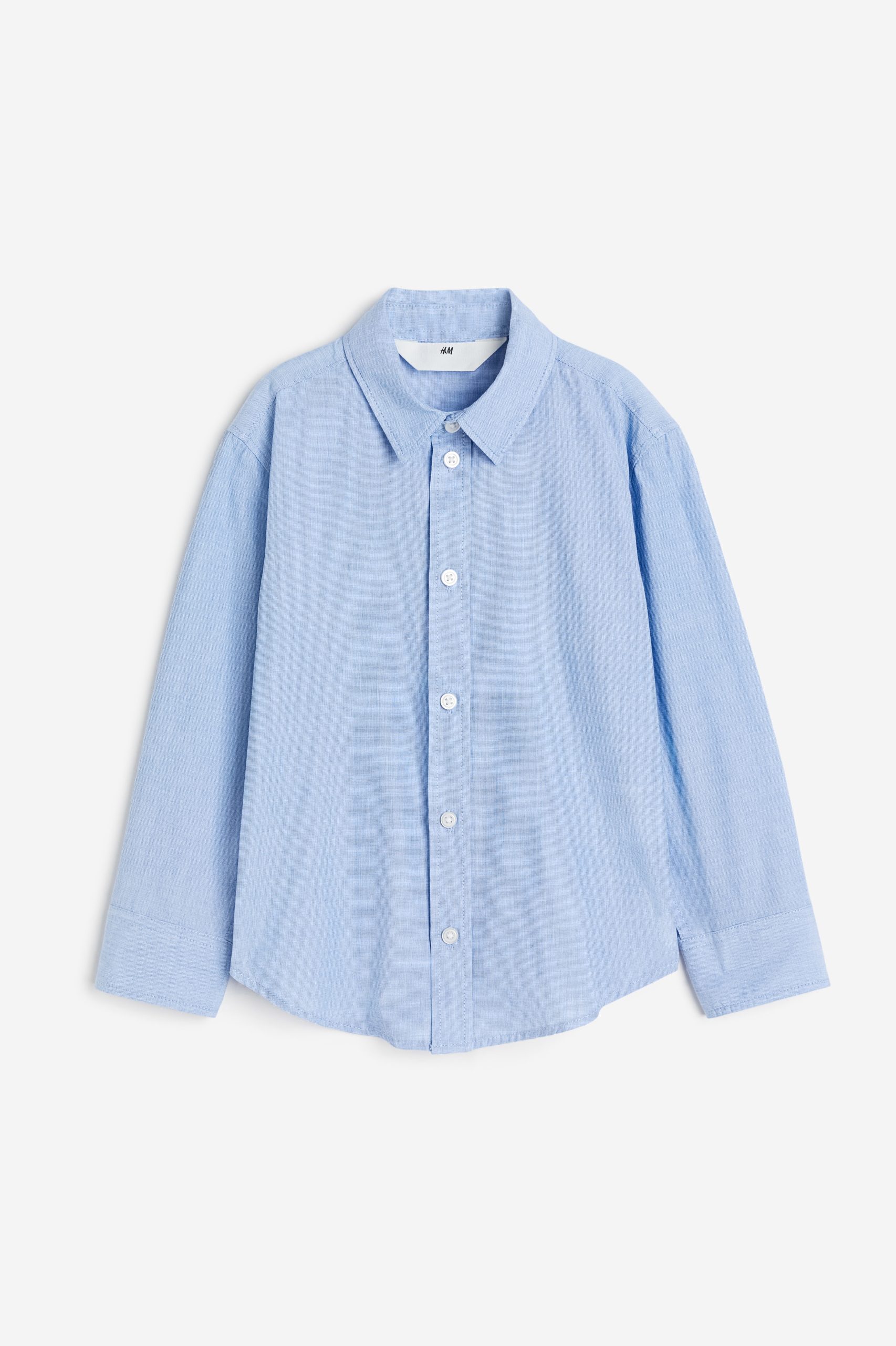 Een overhemd van geweven katoen met een turndown kraag, een knoopsluiting voor en lange mouwen met een manchet met knoopsluiting. Het overhemd is afgerond aan de onderkant en heeft een schouderpas achter.
