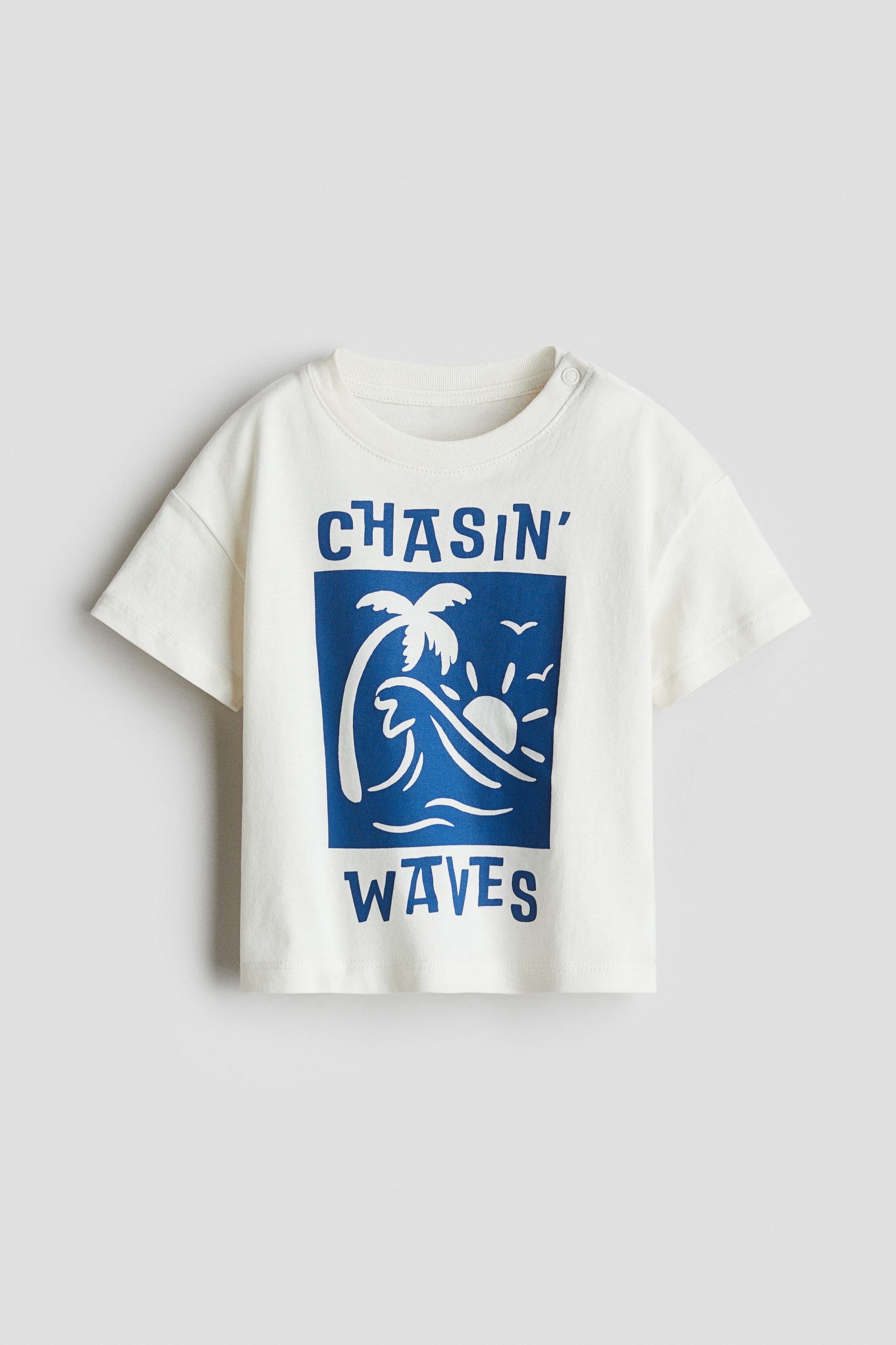Een T-shirt van zacht katoenen tricot met geprinte motieven. Het model heeft een ronde hals met een geribd boordje erlangs en een drukknoop aanéén kant (niet in maat 92-104) en verlaagde schoudernaden.