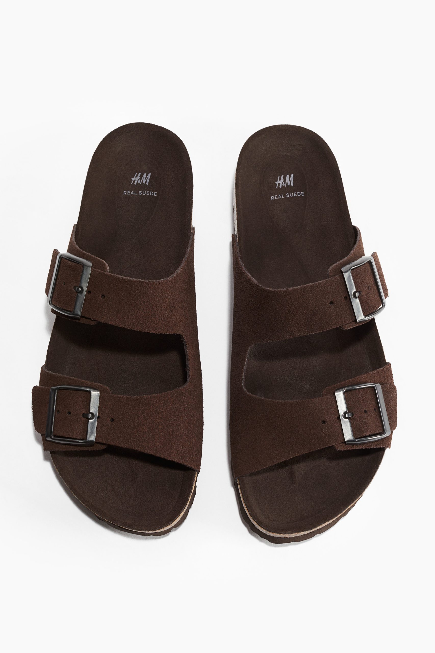 Slippers van zacht leer met verstelbare riempjes over de voet. Het model heeft een zool met voorgevormd voetbed van suède en een profiel aan de onderkant.