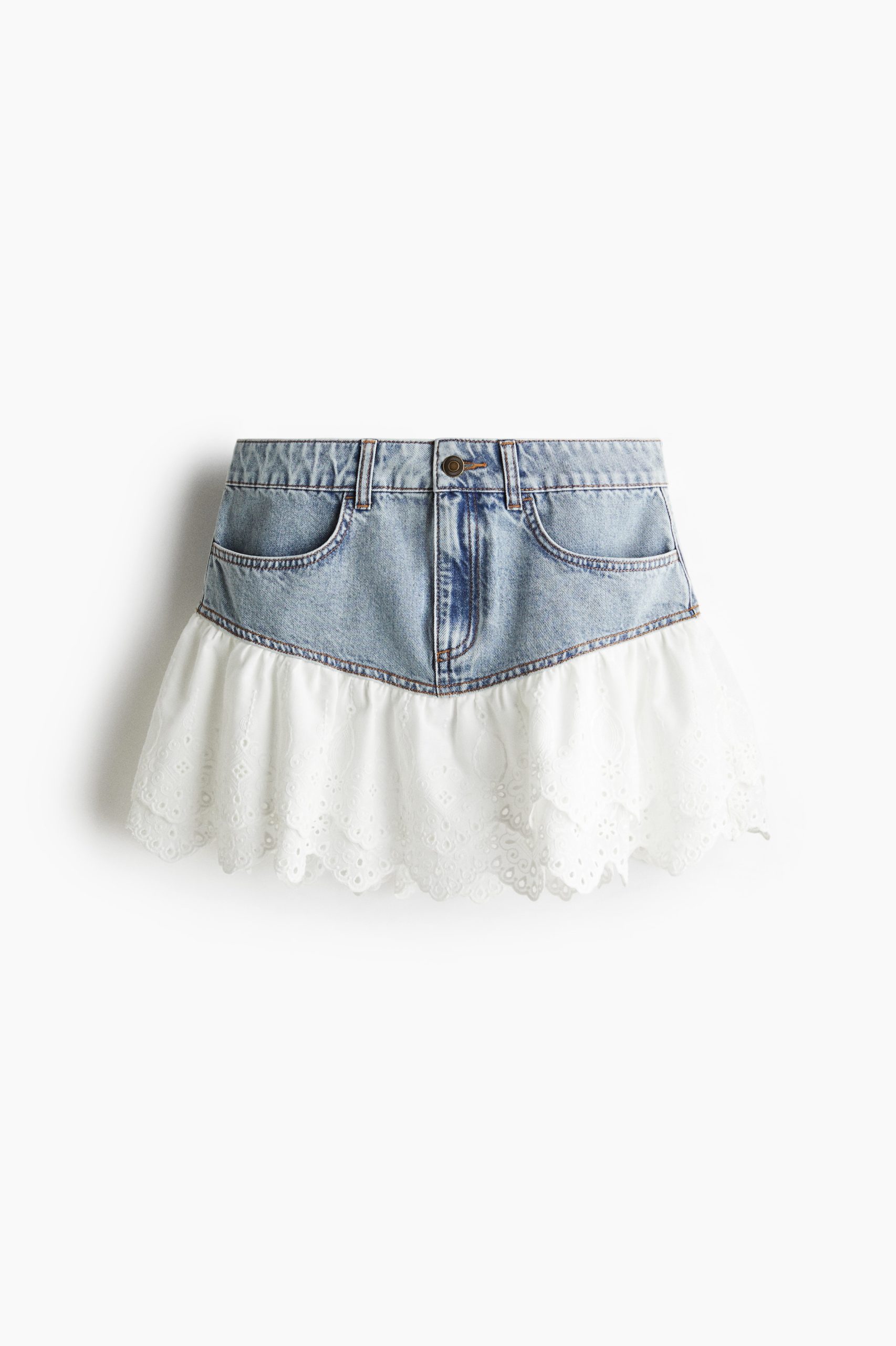 Een minirok van katoenen denim met een brede, dubbele volant van geweven katoen aan de onderkant met broderie anglaise en golvende randen. Het model heeft een lage taille, een gulp met ritssluiting en knoop en voorzakken.