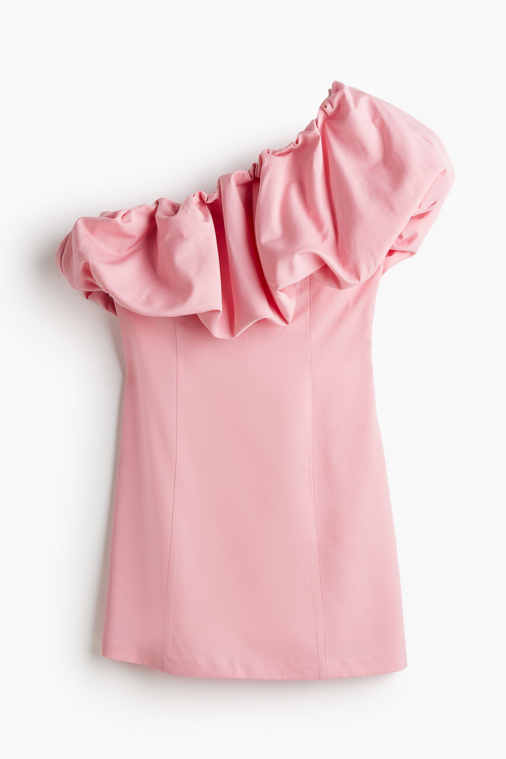 Een korte, nauwsluitende jurk van een geweven kwaliteit met een asymmetrische halsbelijning en een grote, poffende volant rondom aan de bovenkant en overéén schouder. Het model heeft een blinde rits en haak-en-oogsluiting aan de zijkant en coupenaden overlangs voor en achter voor een nauwsluitend silhouet. Gevoerd.
