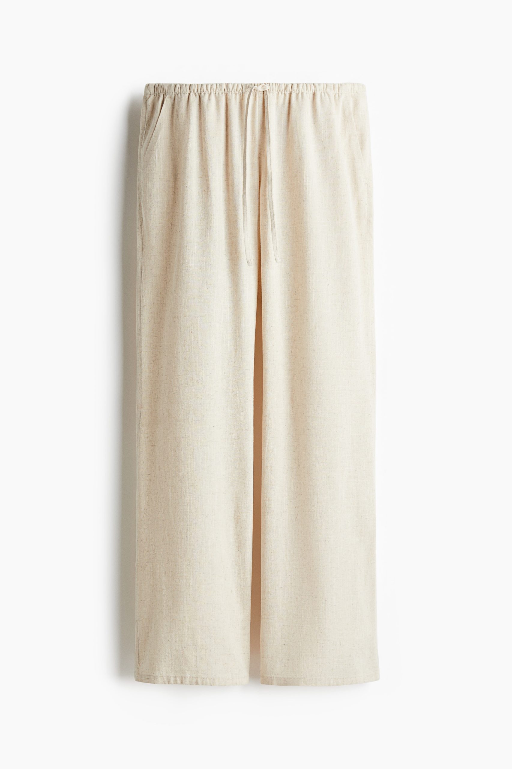 Een broek van luchtig, geweven linnen met een lage taille met bekleed elastiek en een drawstring. Het model heeft schuin ingezette steekzakken en rechte pijpen.