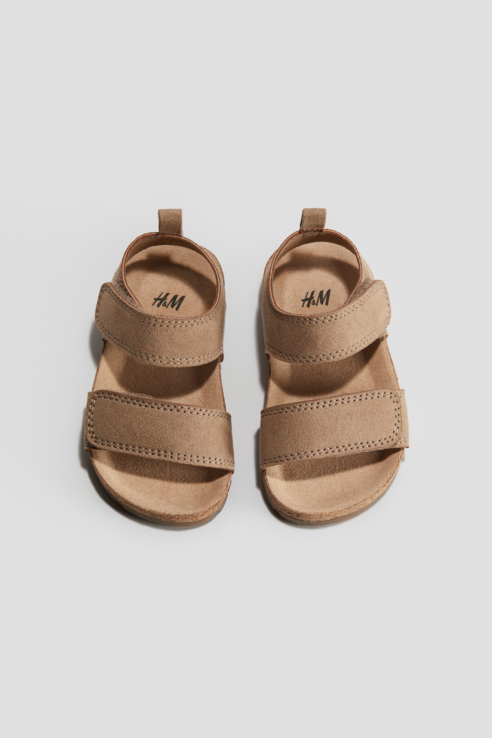 Sandalen van geruwde kwaliteit met een verstelbare klittenbandsluiting over de voet en rond de enkel. Het model heeft een zool met een voorgevormd voetbed en een profiel aan de onderkant. Zool 1,9 cm.