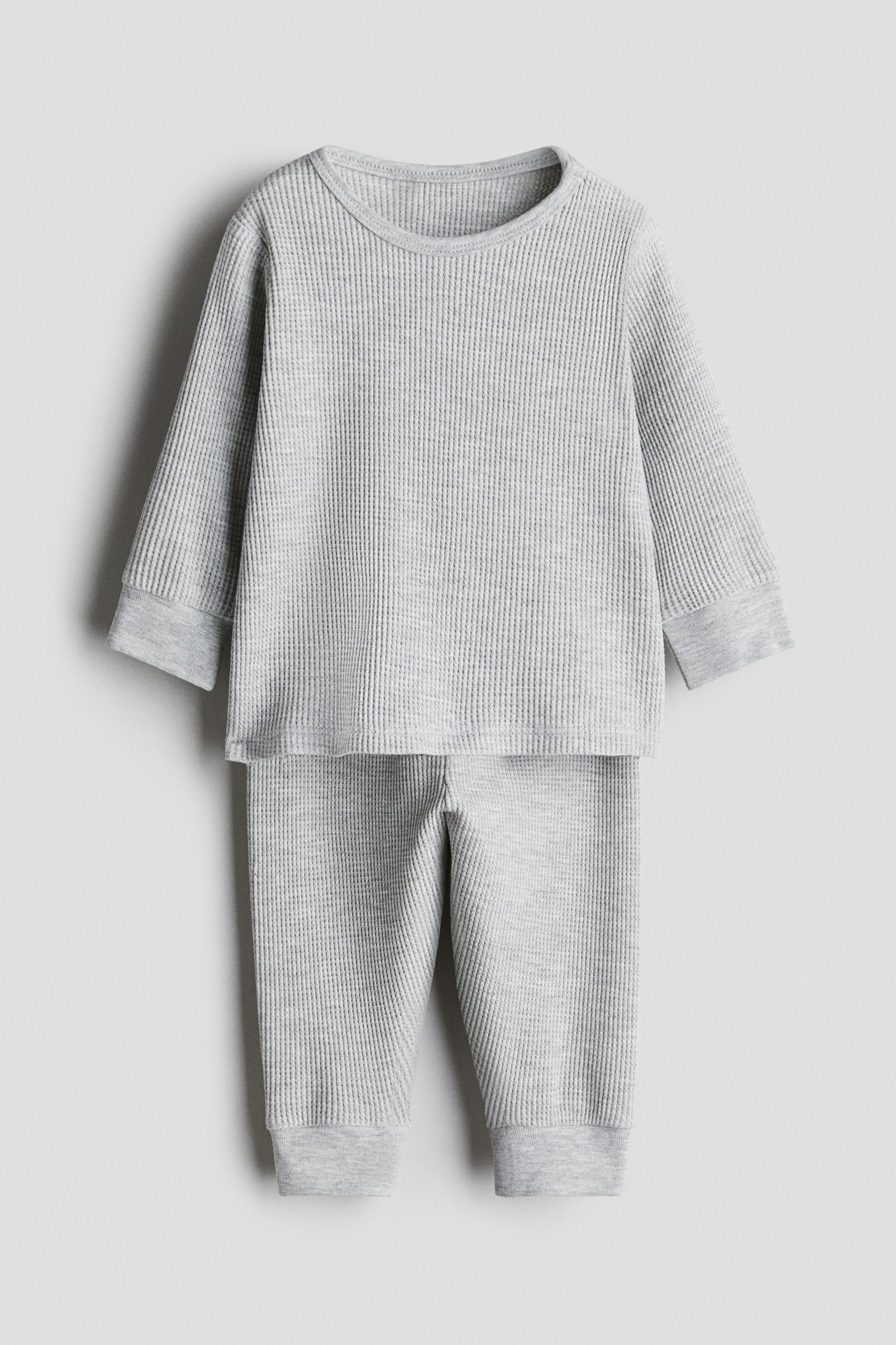 Een comfortabele tricot set bestaande uit een shirt en een broek van zacht, gewafeld katoen. Het shirt heeft een geribd boordje langs de hals, een blinde drukknoop opéén schouder (niet in maat 98-104) en lange mouwen met een geribde boord onderaan. De broek heeft bekleed elastiek en een drawstring in de taille en een geribde boord onder aan de pijpen.