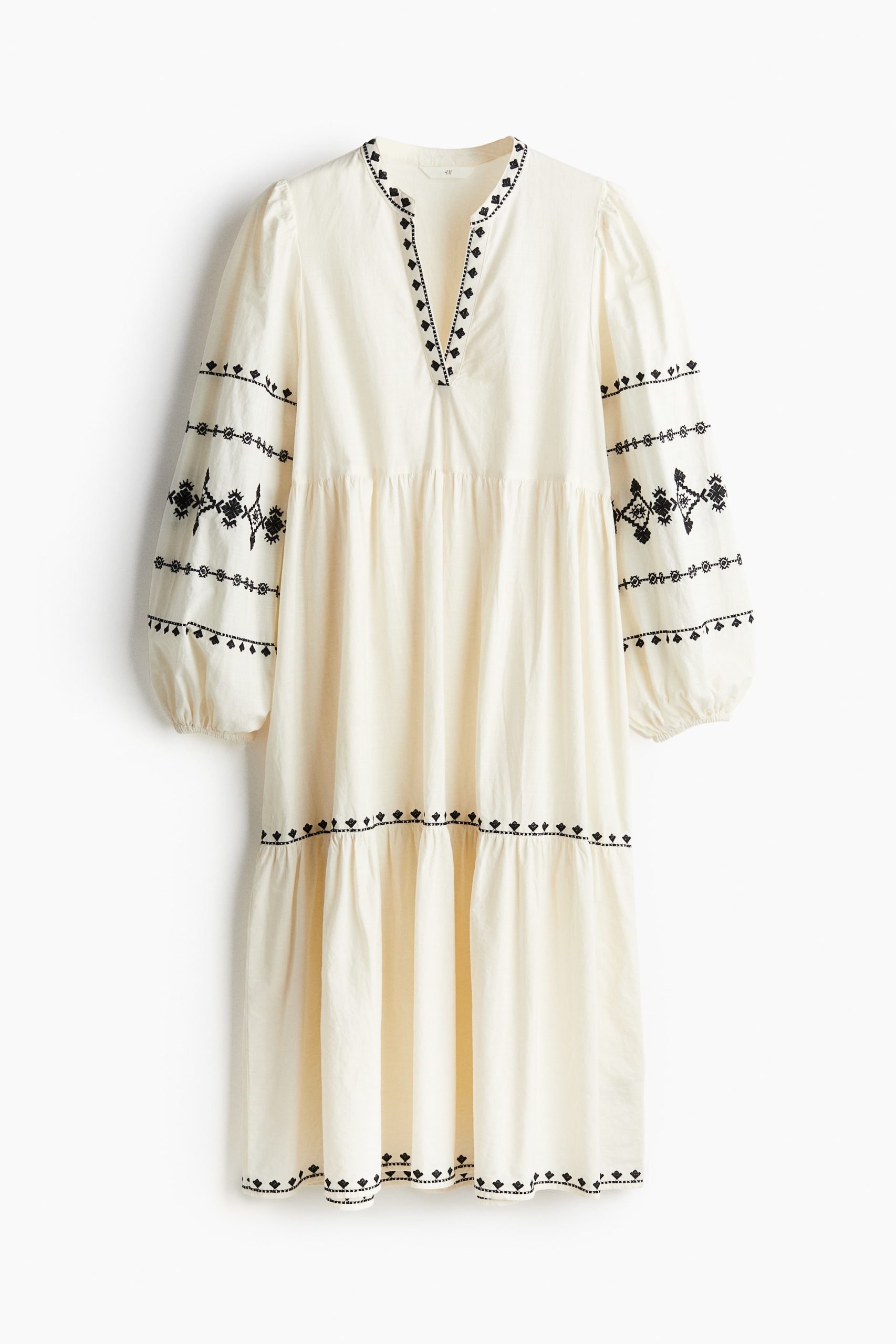 Een midi-jurk van geweven katoen met een ruime pasvorm en geborduurde details in een accentkleur. Het model heeft een ronde hals met een V-splitje voor, lange ballonmouwen met elastiek onderaan en een ingerimpelde naad in de taille en halverwege de rok voor extra volume. Ongevoerd.