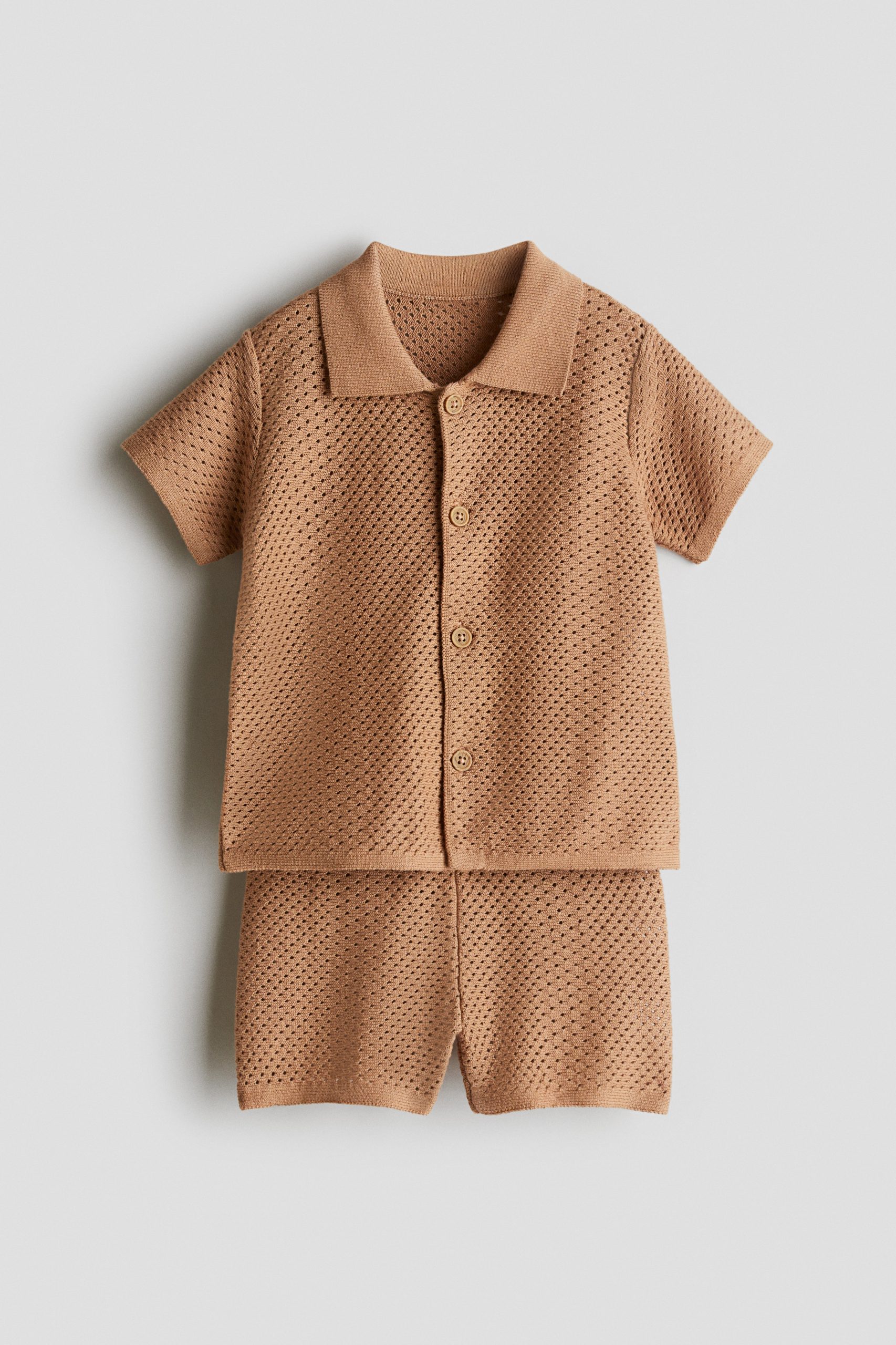 Een set bestaande uit een overhemd en een short van zacht, opengebreid katoen. Het overhemd heeft een geribde kraag, korte mouwen, een knoopsluiting voor en een fijngebreide boord aan de onderkant en onder aan de mouwen. De short heeft elastiek en een drawstring in de taille en een fijngebreide boord onder aan de pijpen.