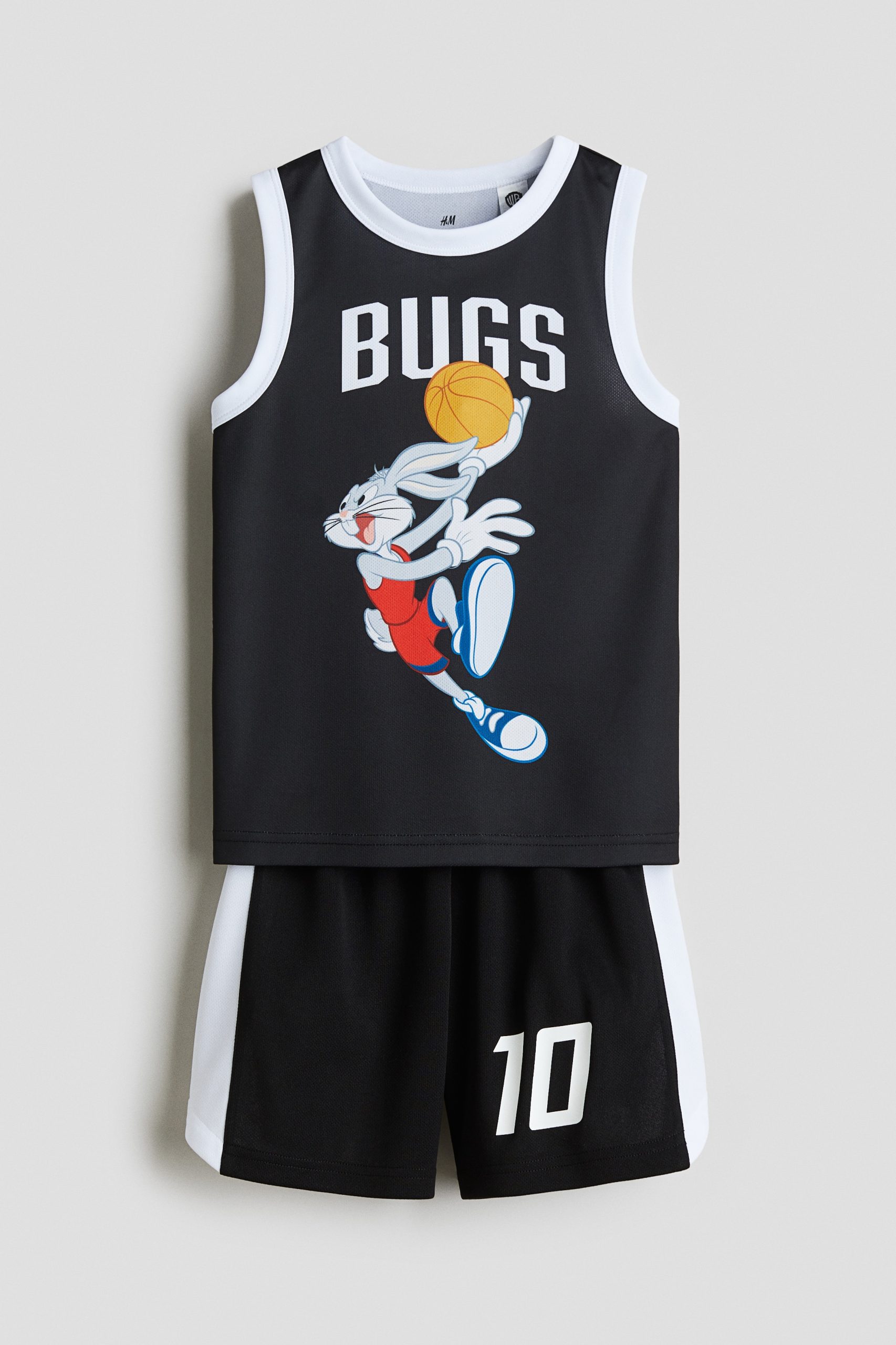 Een basketbalset bestaande uit een tanktop en een knielange short van meshtricot met een print. De tanktop heeft een ronde hals en biezen in een contrasterende kleur aan de bovenkant. De short heeft elastiek en een blinde drawstring in de taille en een zijsplitje onder aan de pijpen.