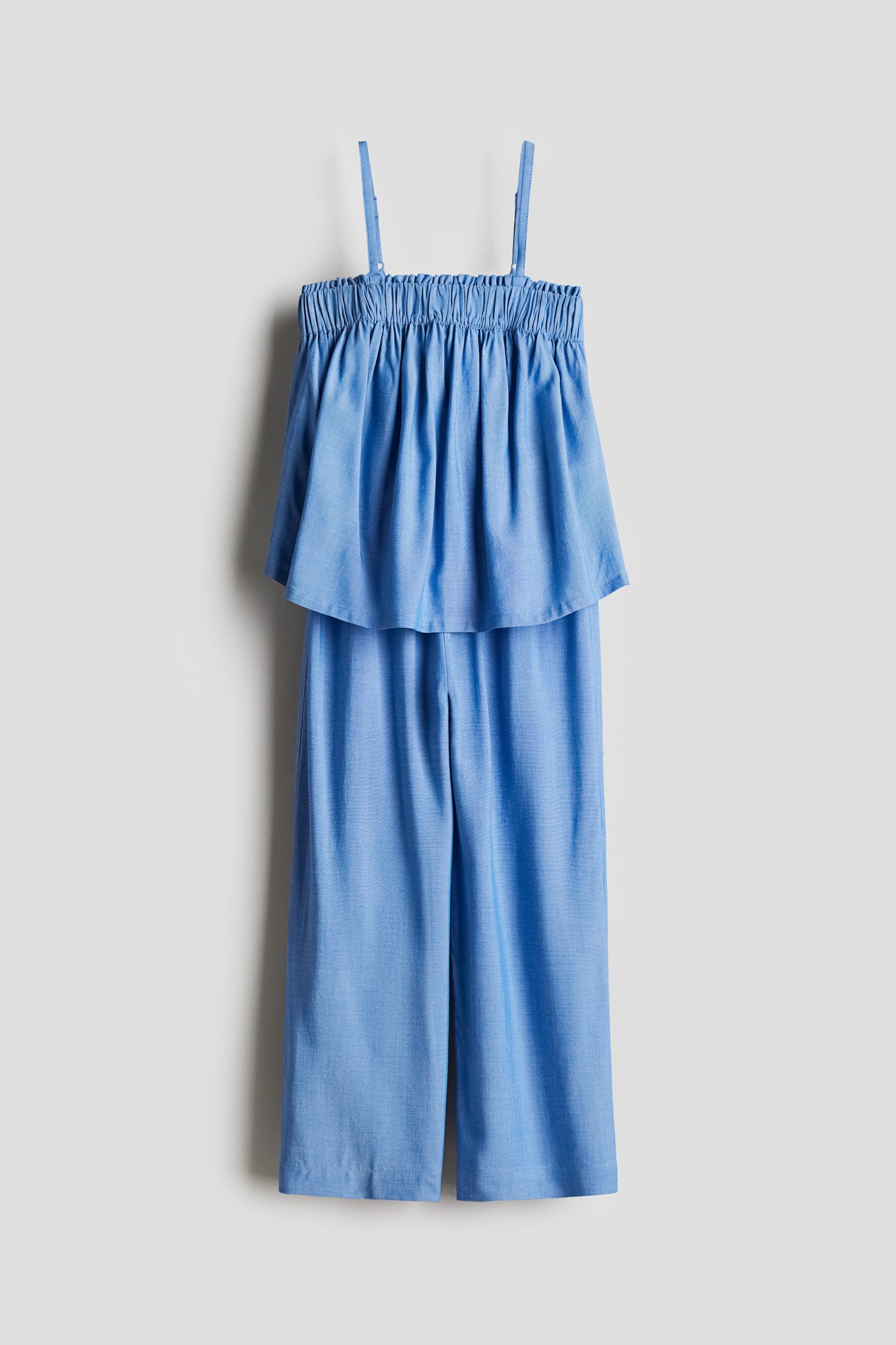 Een set bestaande uit een top en een broek van zachte, geweven kwaliteit. De top heeft smalle, verstelbare schouderbandjes, een vierkante halslijn, elastiek langs de bovenrand en een licht afgeronde belijning aan de onderkant. De broek heeft elastiek in de taille.