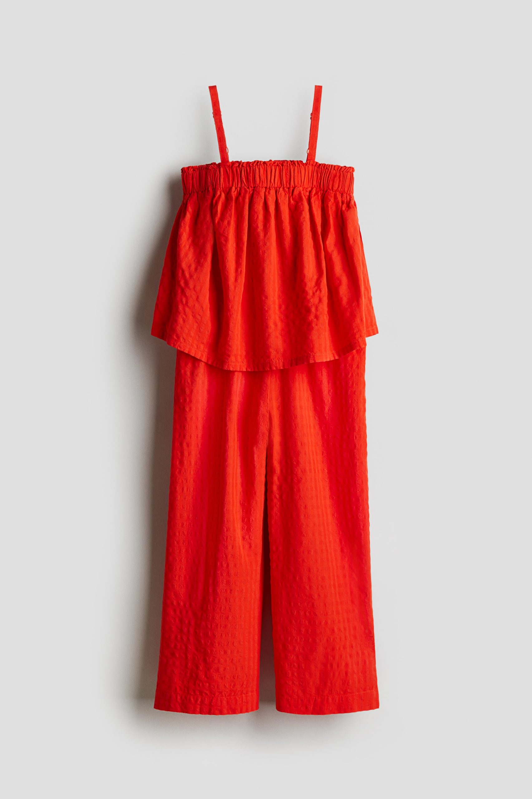 Een set bestaande uit een top en een broek van zachte, geweven kwaliteit. De top heeft smalle, verstelbare schouderbandjes, een vierkante halslijn, elastiek langs de bovenrand en een licht afgeronde belijning aan de onderkant. De broek heeft elastiek in de taille.