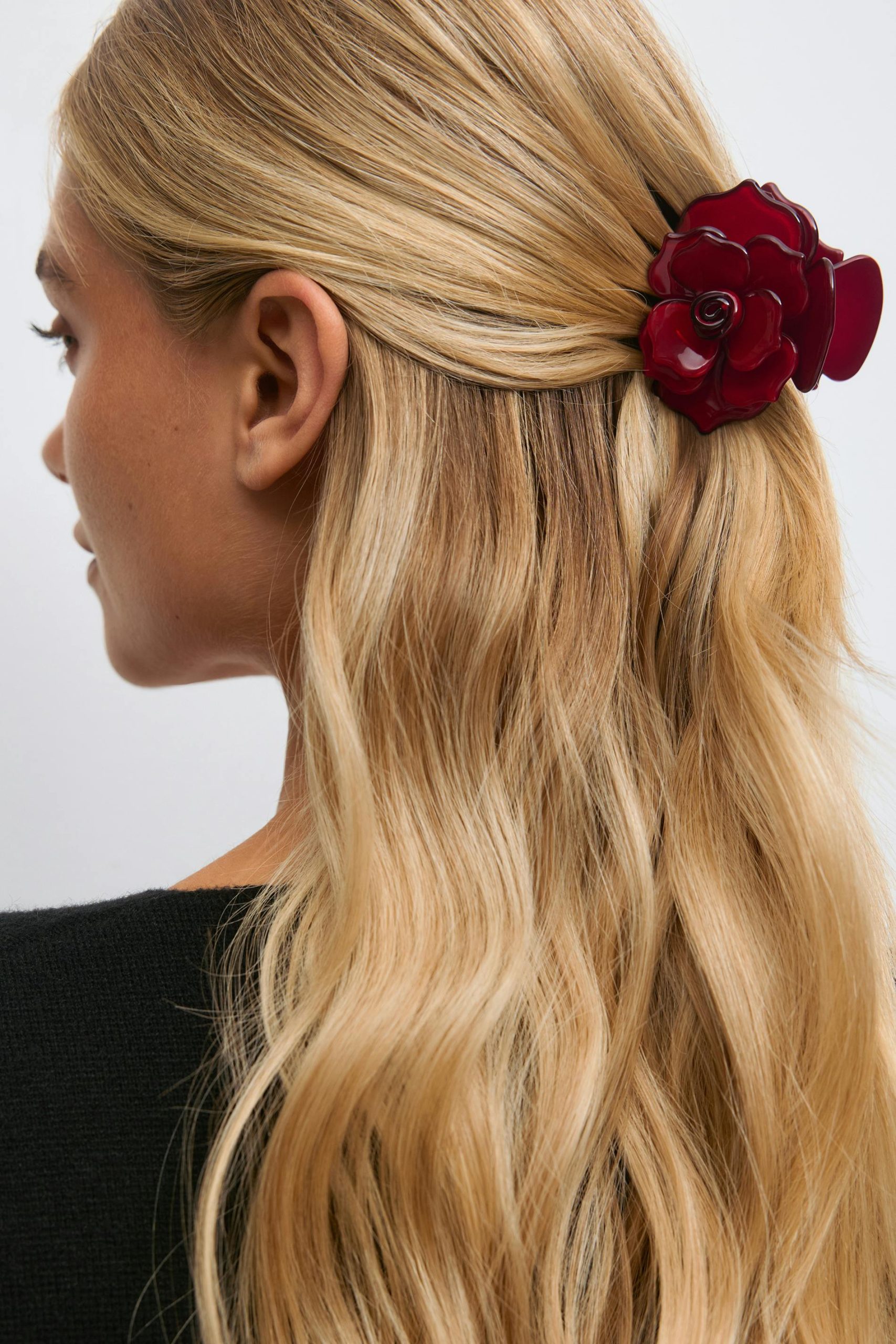 Smalle haarklem in de vorm van een roos. De haarklem is rood.
