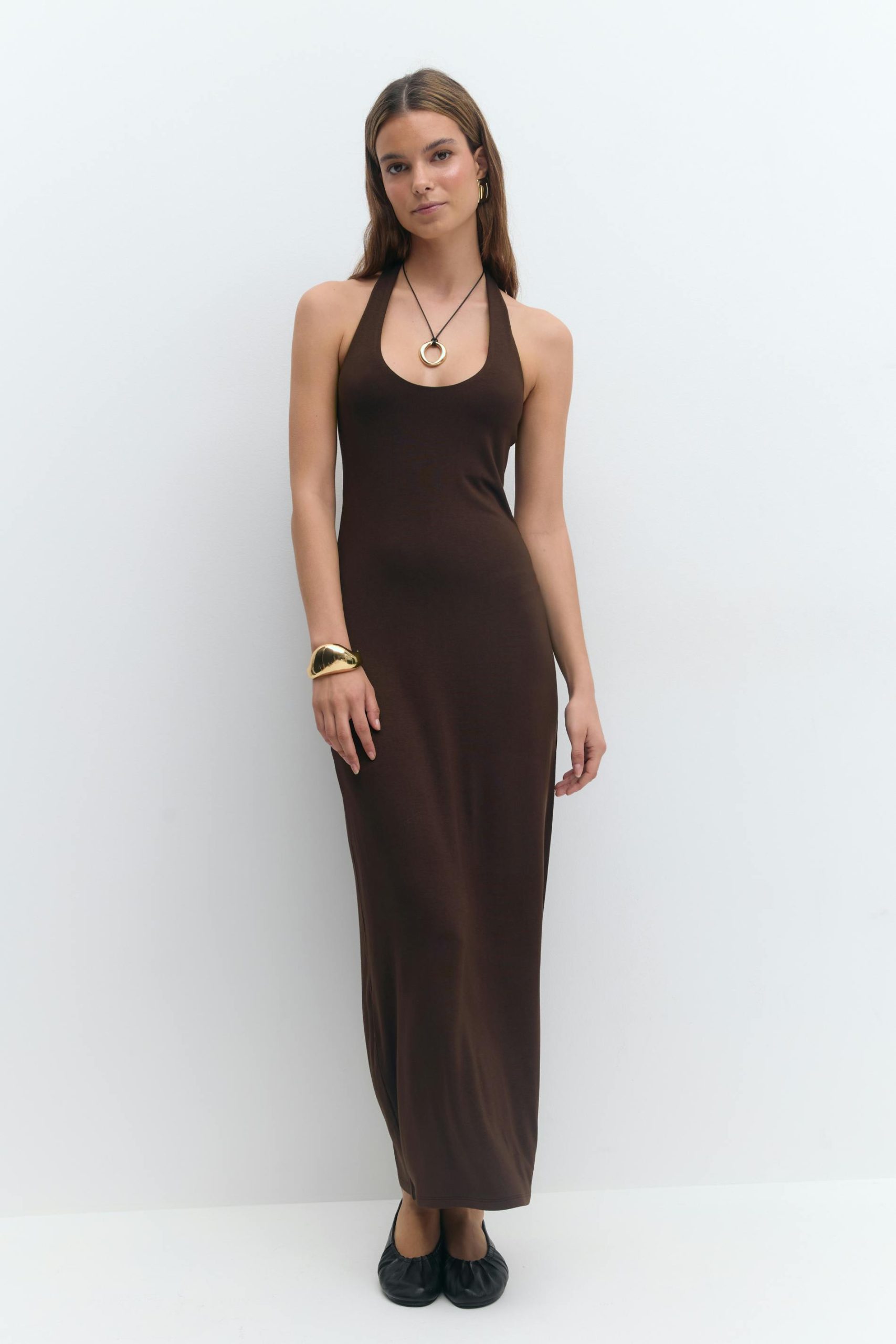 Halterjurk met een zelfbinder aan de hals. De jurk is bruin en heeft een diepe halsuitsnijding. Het heeft een open rug en een normale pasvorm.