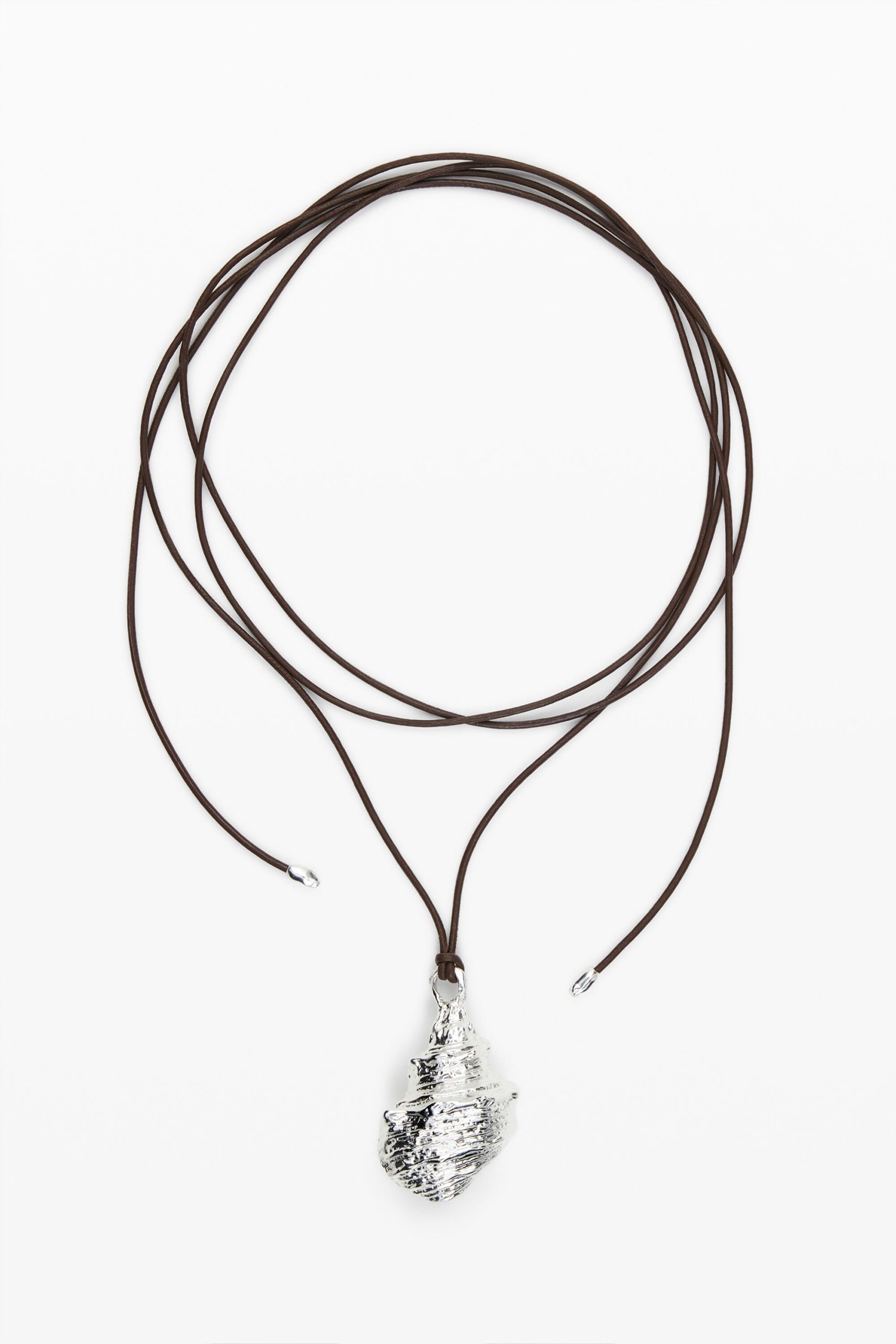 Hanger in de vorm van een zeeschelp, verzilverd met 1e wet zilver van 3 micro inch met verstelbaar katoenen koord. Collectie Zalio x Desigual; ontworpen door Gala Meyer. Kan ook als armband worden gebruikt.