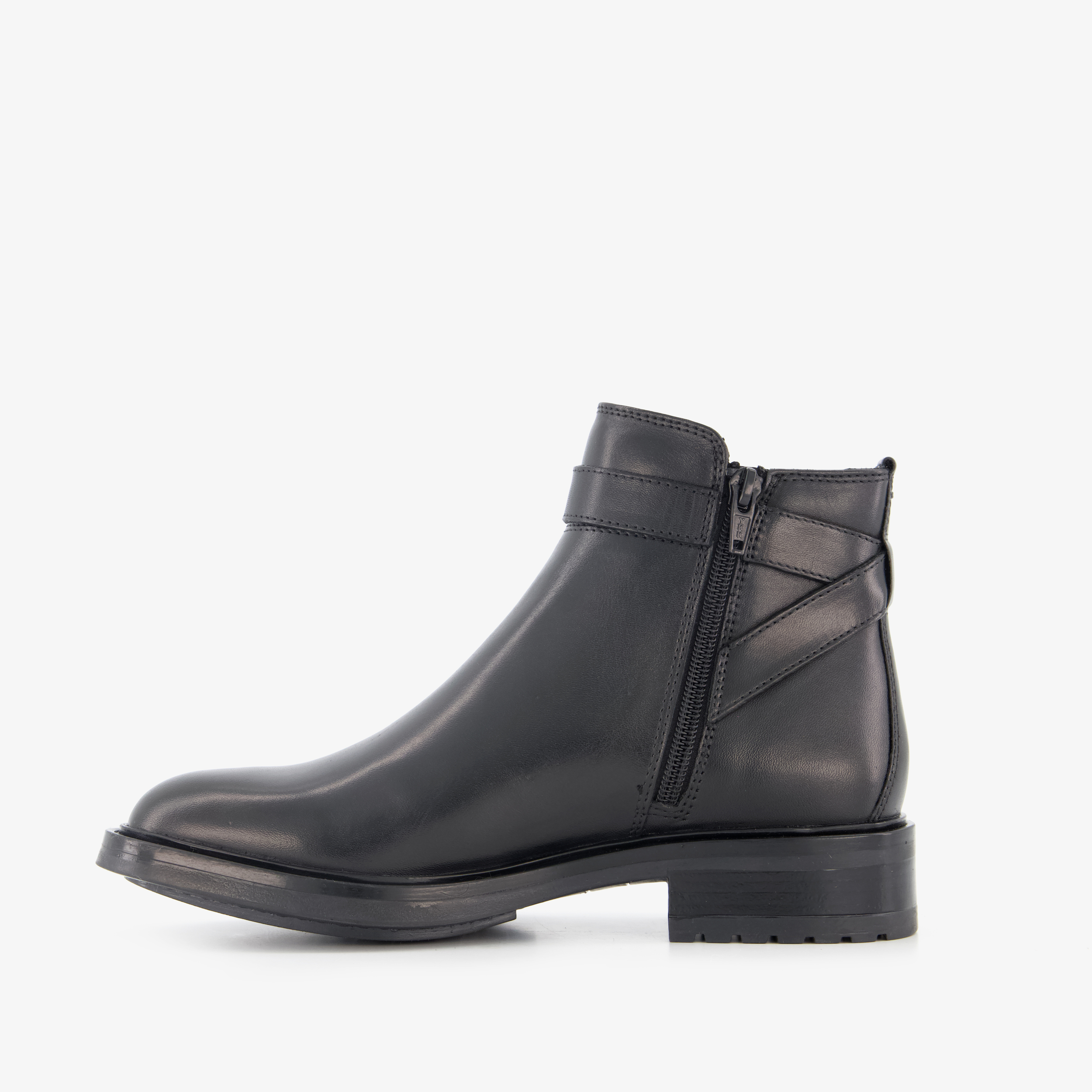 Zwarte enkellaarzen voor dames uit de Harper collectie. Het buitenwerk is gemaakt van leer, het binnenwerk van textiel en de stevige buitenzool met profiel is van rubber. Voorzien van een ritssluiting aan de binnenzijde en een gesp aan de buitenzijde. De laarsjes hebben een laag hakje van circa 2 cm en een schachthoogte van 12 cm. Binnenzool is niet uitneembaar.