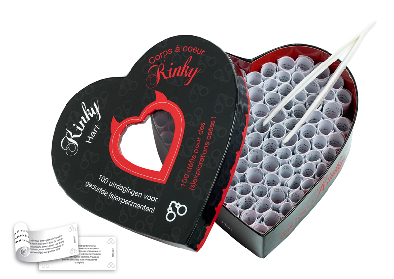 100 kinky uitdagingen voor gedurfde (s)exploraties! Een uitdagend spel voor jou en je partner (f/f, m/f of m/m) als je openstaat voor spannende (s)experimenten. Jij of je partner neemt met het pincet een rolletje uit het hart. Wat gaat er gebeuren? Ga je een geheime fantasie vervullen of een compleet nieuwe ervaring aangaan? Ontdek de grenzen van je seksuele relatie en beleef je meest intieme momenten samen. De Kinky Hearts neemt je mee op een seksuele reis en is niet te vergelijken met enig ander spel. Meer dan 100 kinky taken en ideeën bevinden zich in deze hartvormige doos. De glanzende styling zal een breed publiek aanspreken en geeft een echt fetisj-impressie. Taal: Nederlands en Frans.
