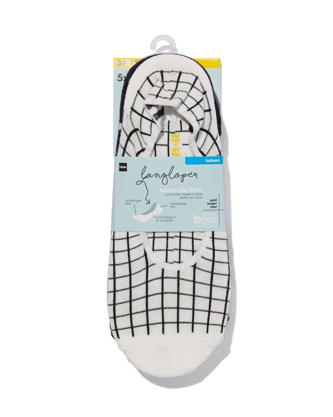 Set van vijf paar katoenrijke dames footies in de kleuren wit en zwart. De sokken zijn effen of hebben een dessin met stippen, strepen of ruiten. De tenen en hielen zijn verstevigd, waardoor je minder snel gaatjes krijgt. De speciaal gevormde hiel voorkomt dat de sokken afzakken. De footies zijn gemaakt van gekamd katoen met langere vezels, waardoor ze niet alleen mooier maar ook sterker zijn en deze langlopers langer meegaan.