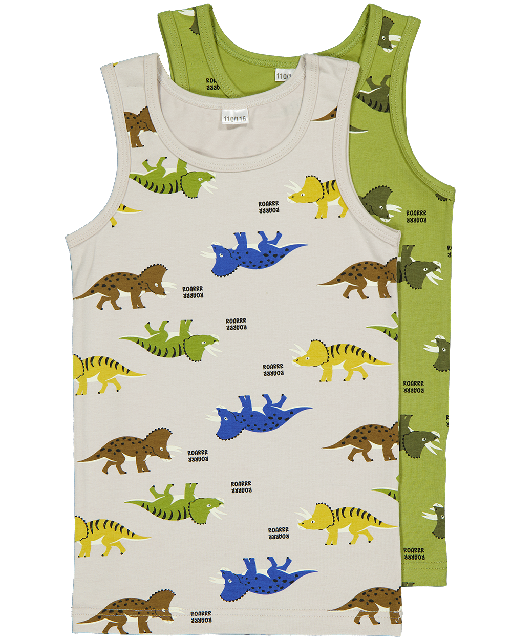 Set van 2 jongenshemden met een vrolijke dinoprint in verschillende kleuren. Gemaakt van katoen met polyester en elastaan, waardoor het hemd zacht aanvoelt en licht mee rekt. De brede schouderbanden zorgen voor een goede pasvorm en blijven goed zitten. Deze hemden zijn comfortabel en praktisch voor elke dag.