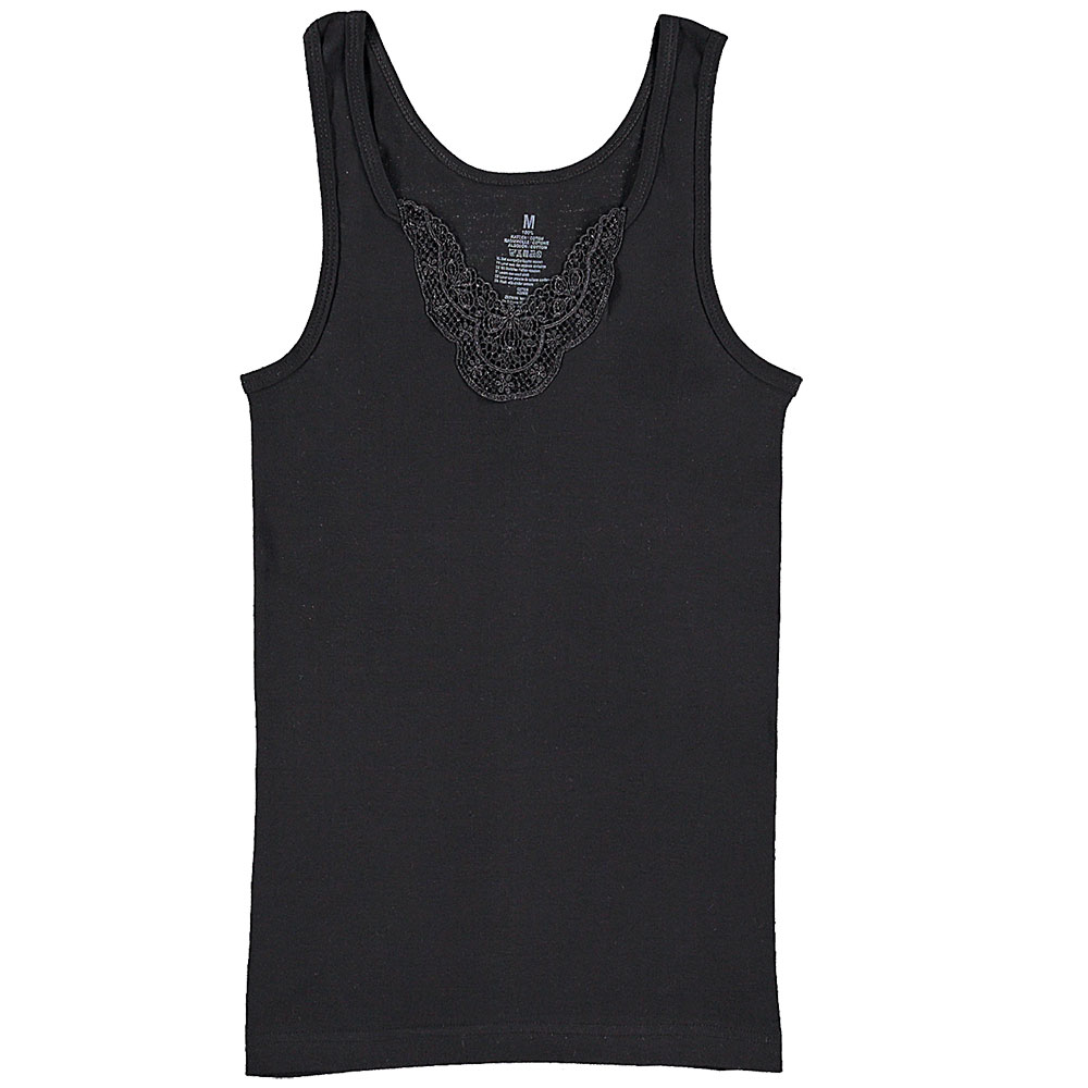 Dit zwarte dameshemd is gemaakt van 100% katoen. Dankzij de zachte, ademende stof biedt het optimaal draagcomfort. Het mouwloze model is afgewerkt met een verfijnd kanten detail langs de halslijn, wat een elegante uitstraling geeft. Ideaal om onder andere kleding te dragen, maar ook mooi als bovenkleding op warme dagen.